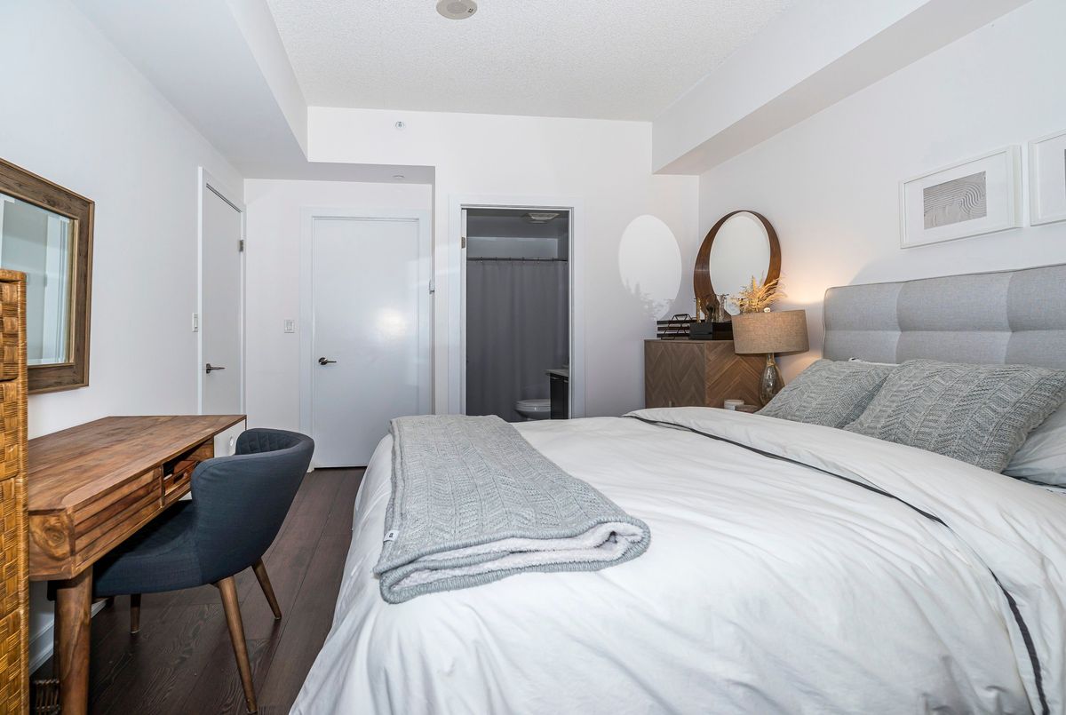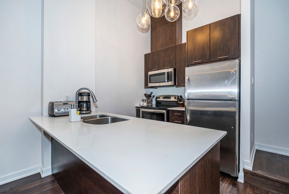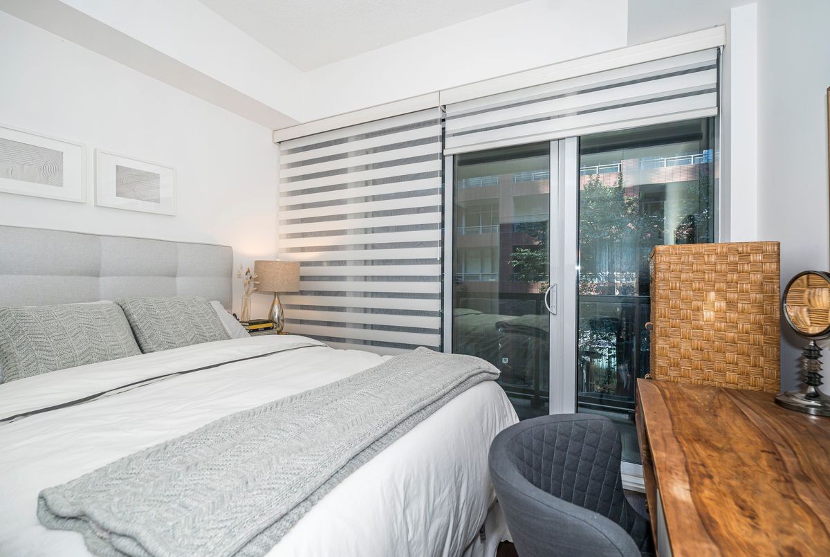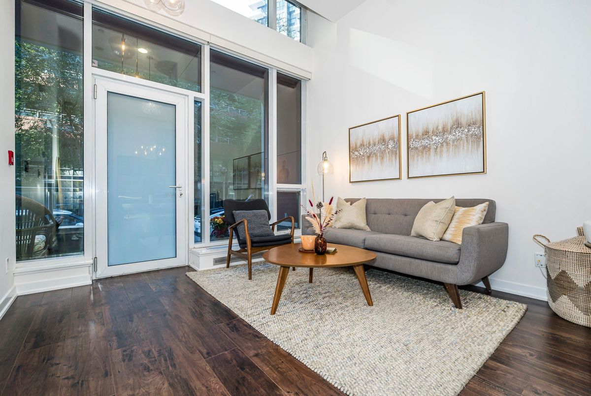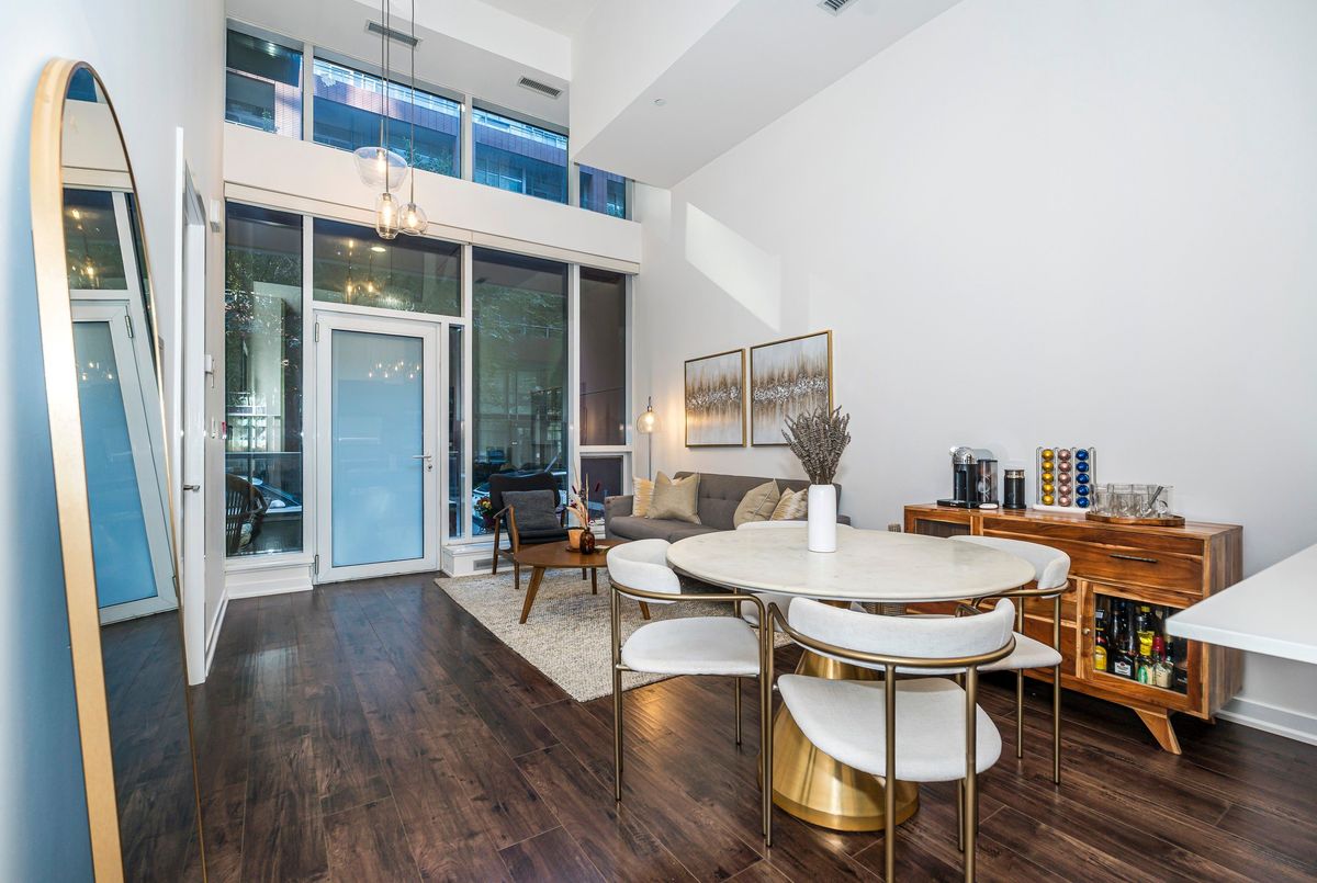3-Bedrooms, 3 Full Bathrooms In This Rarely Offered Townhome with Soaring Ceilings! Don't miss out on this exceptional opportunity to own a beautifully maintained townhome where each bedroom enjoys its own private or semi-private bathroom offering an ideal layout for both investors and end users. This thoughtfully designed residence perfectly blends comfort, functionality, and refined style. The open-concept main level boasts high-quality laminate flooring throughout, dramatic 15-ft ceilings, and floor-to-ceiling windows that flood the home with natural light. A private patio extends the living space outdoors, creating a welcoming retreat for relaxation or entertaining. The chef inspired kitchen is beautifully appointed with a double undermount sink, quartz countertops, breakfast bar, and sleek cabinetry, making it perfect for both everyday living and hosting guests. The primary bedroom features a 4 piece ensuite, walk-in closet, and a private balcony, creating the perfect blend of comfort and privacy. A versatile den area offers an ideal space for a home office or reading nook. Every detail reflects pride of ownership, from the pristine finishes and beautiful upgraded light fixtures to the automated Hunter Douglas blinds on the main floor and custom blinds on the second level. Residents of this boutique community enjoy a wide range of amenities, including 24-hour concierge service, a fully equipped fitness centre, rooftop terrace, spacious party room, guest suites, media lounge, and visitor parking. The location is unbeatable with easy access to King West, Billy Bishop Airport, and TTC transit at your door, plus nearby parks, waterfront trails, restaurants, and entertainment. Everyday essentials are just steps away, with a Farm Boy up the street and LCBO, Loblaws, and Shoppers Drug Mart conveniently located across the road. The Rogers Centre, CN Tower, and countless downtown attractions are also just minutes from your door.