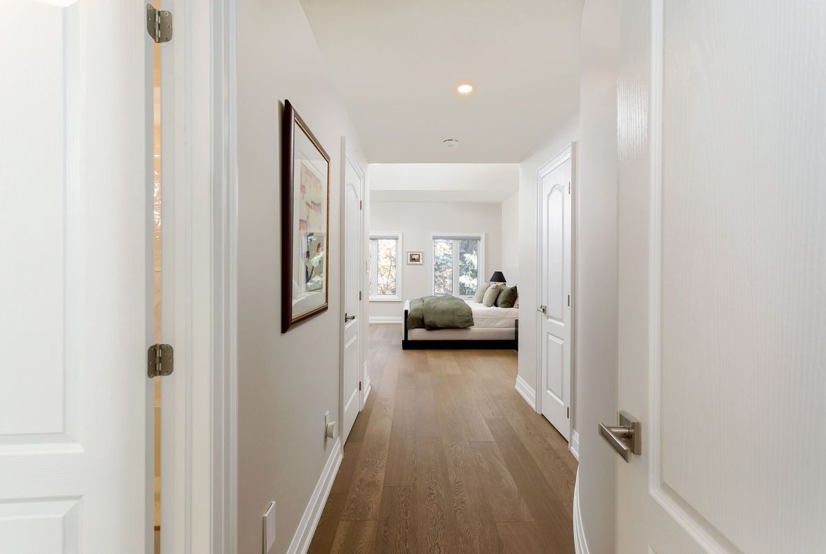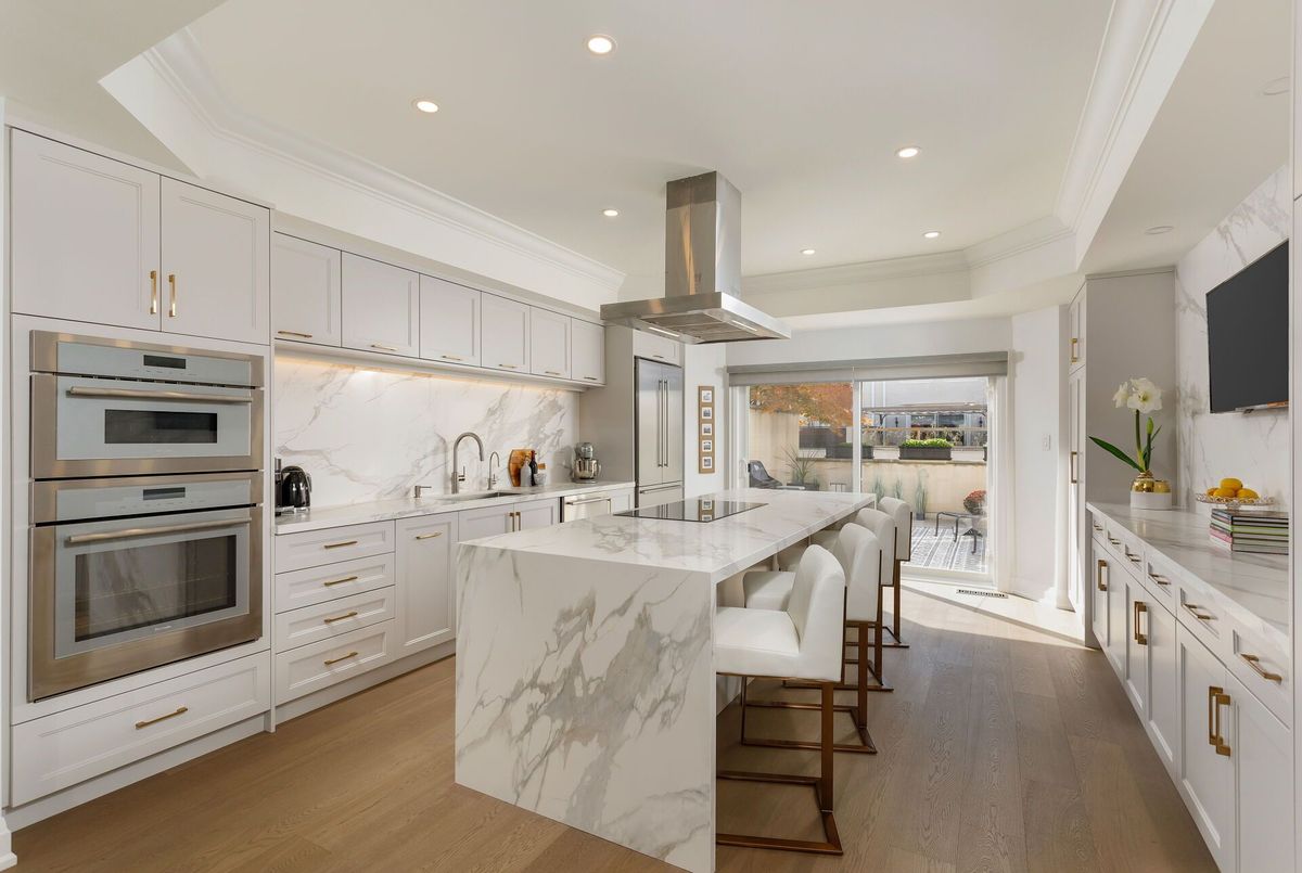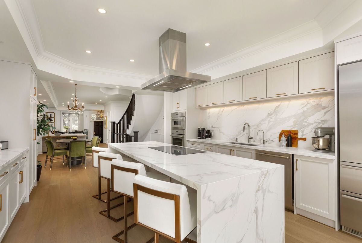 Newly rebuilt (2025, approx 3438 finished interior) iconic townhome with spectacular kitchen, rare two storey primary bedroom and 2 car garage at foot of Casa Loma. Where Lower Forest Hill and the Annex meet, one of Toronto's most iconic Georgian-Inspired Limestone clad townhomes has a new contemporary interior. Fronting on Spadina Rd lush Parkette, the living room overlooks the 11' foyer, has wide oak wooden flooring, crown moulding and bar nook to compliment the adjoining dining room with judges panelling. A sleek art-deco powder room and classic curved staircase enhance this design savvy entertainers' home. Kitchen features premium quartz counters, slab backsplashes and 10' waterfall dining island with induction cooktop, premium appliances, finely crafted cabinetry, two pantries and full-width glass sliding doors to terrace. 2nd floor bedroom with walk-in, adjacent 3-pc bath, spacious family room (22 x 15) with two custom media stations, 60" electric fireplace, and built-in art recess. Rare primary bedroom with 16' sloped ceiling, skylights, styled with white judges panelled walls, light oak floors, striking dark stained staircase railings, treads, and white risers to loft lounge/gym/ office options and roof terrace. Two closets, elegant 5-pc ensuite with glass shower, double vanity, quartz counters, marble basket weave flooring, golden hardware. Third bedroom and ensuite add versatility for growing families or downsizers. Lower level 4th bedroom or gym, 4-pc bathroom, laundry room, and access to 2 car tandem garage with electric charger. Freehold townhome with association fee to cover professional landscaping and snow removal. Walking distance to subway, Dupont / Bloor / Yorkville shops, Forest Hill Village and Sir Winston Churchill Park. Turn key elegant living in prime location.