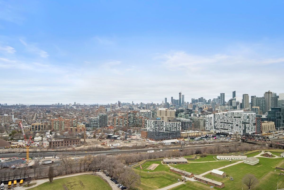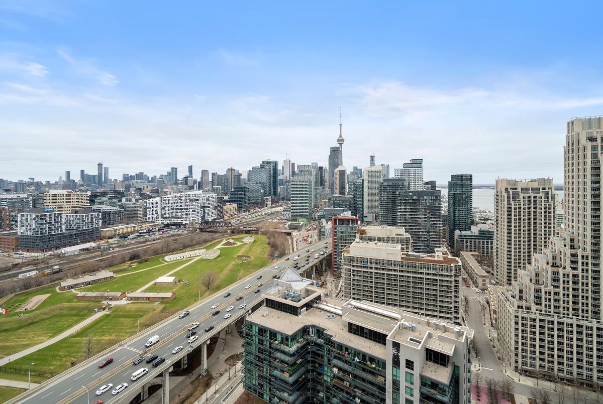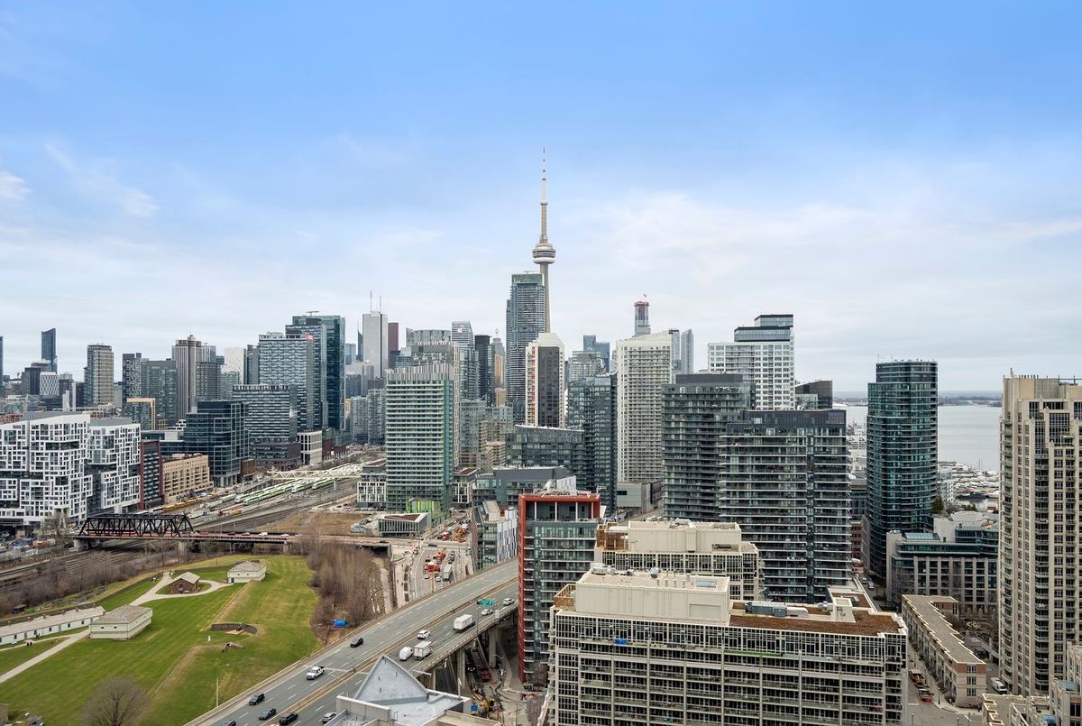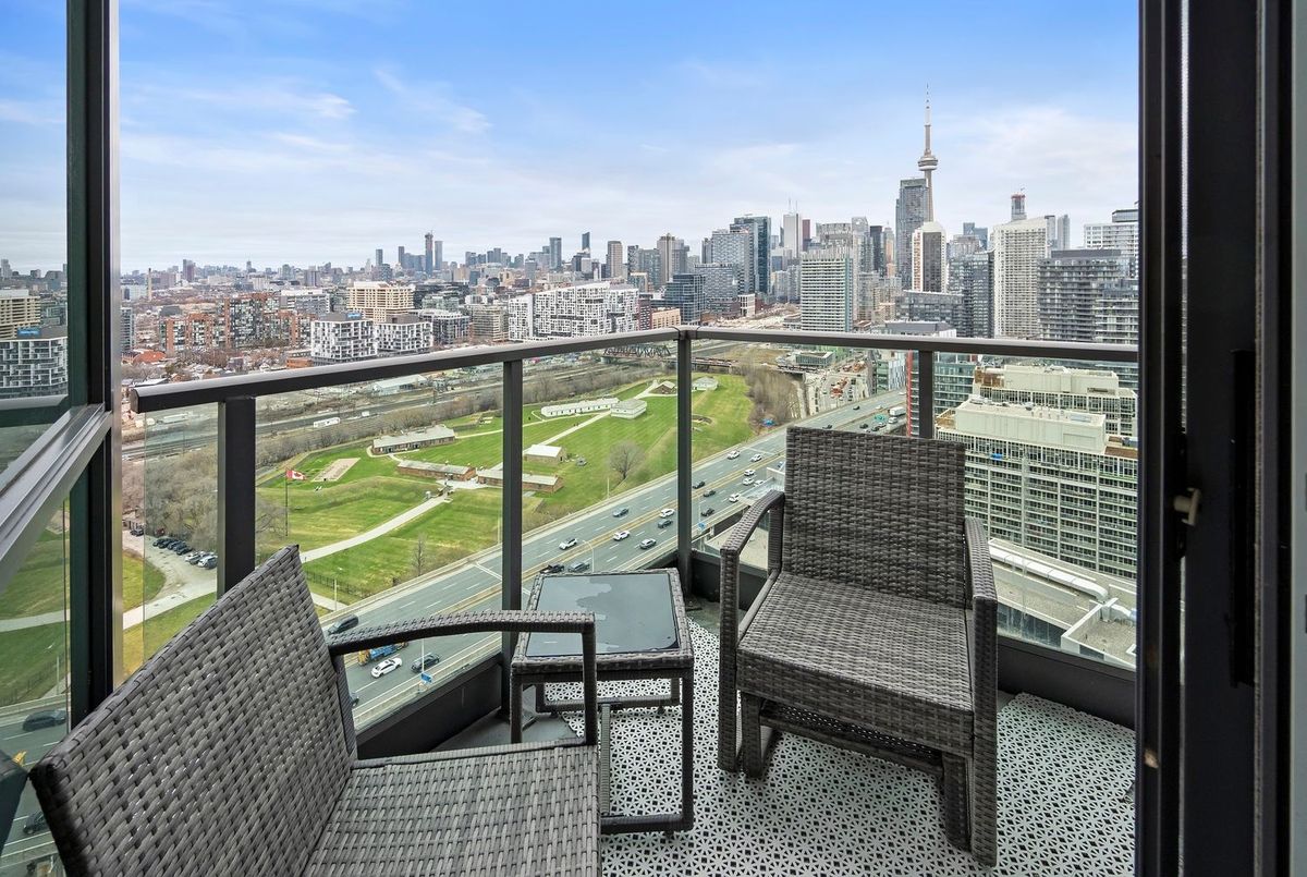 Stunning panoramic views greet you from every corner of this exceptional suite-featuring sweeping vistas of the lake, the city skyline, and Fort York Park. Floor-to-ceiling windows throughout flood the space with natural light, creating a bright and inviting atmosphere, including a full-length window in the kitchen.This beautifully designed split two-bedroom, two-bathroom layout offers both style and functionality. The open-concept living and dining area is thoughtfully arranged, providing ample space for a full dining table and generous living room furnishings-perfect for entertaining.The spacious primary bedroom comfortably accommodates a dresser and additional seating, complete with a double closet and room for a cozy reading nook. The second bedroom is ideal as a home office or guest room, offering flexibility for modern living.The tastefully renovated kitchen shines with built-in features and a central island-an ideal setting for cooking, entertaining, or enjoying a glass of wine with friends.Unwind on your private balcony and take in the vibrant energy of the city alongside tranquil lake views. This is truly one of the most desirable layouts in Toronto condo living-an exceptional opportunity not to be missed. Right in the heart of the city - there is so much to walk to and enjoy. King West/Queen West/Trinity Bellwoods/Liberty Village /the Lake/Bike Paths/Shops/Cafes - the list is endless! TTC - easy access to the Gardiner/Lakeshore and Island Airport at your doorstep.