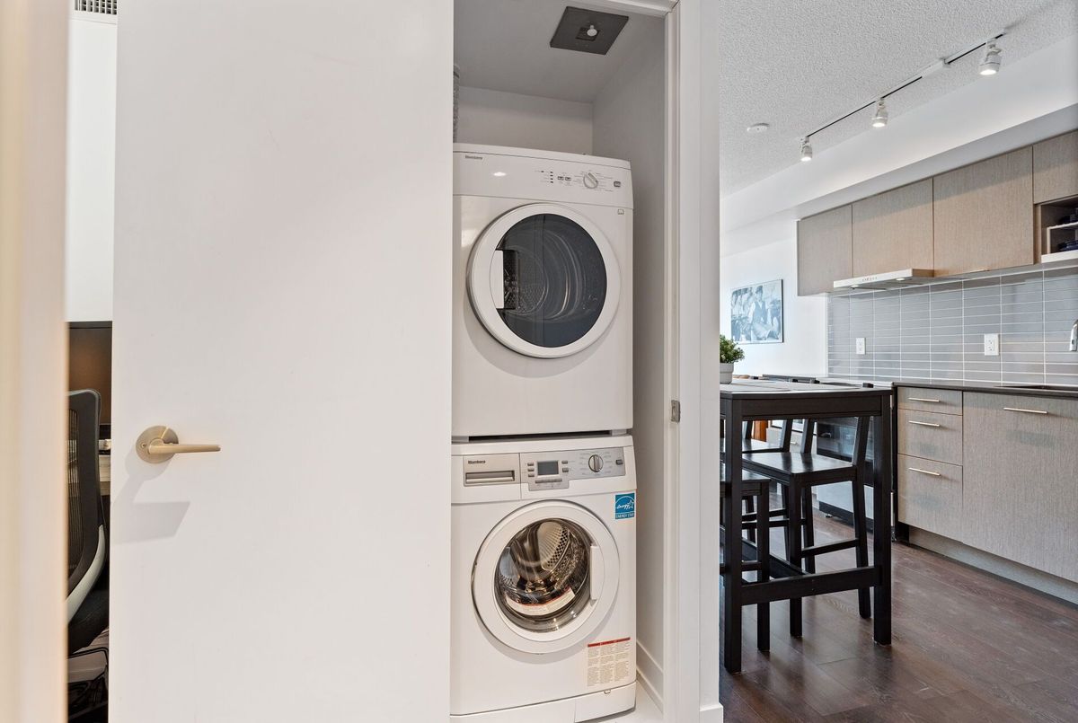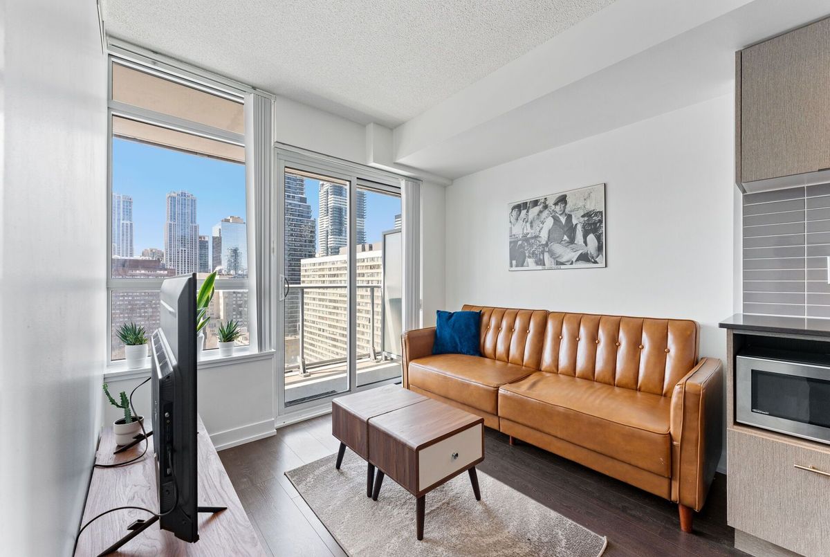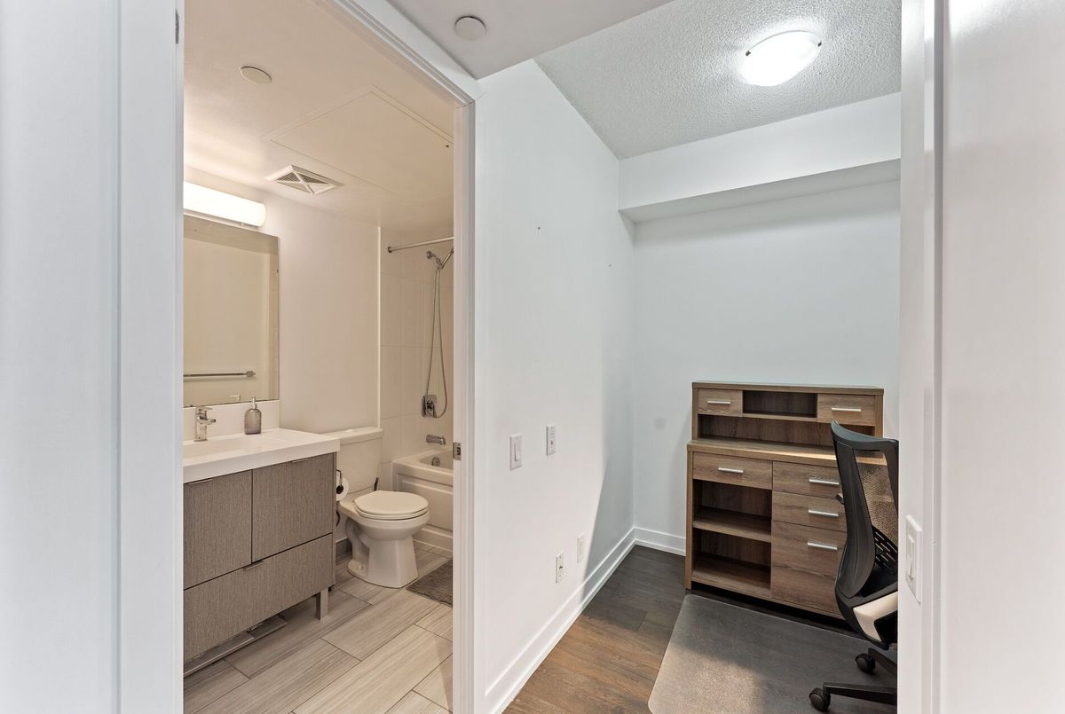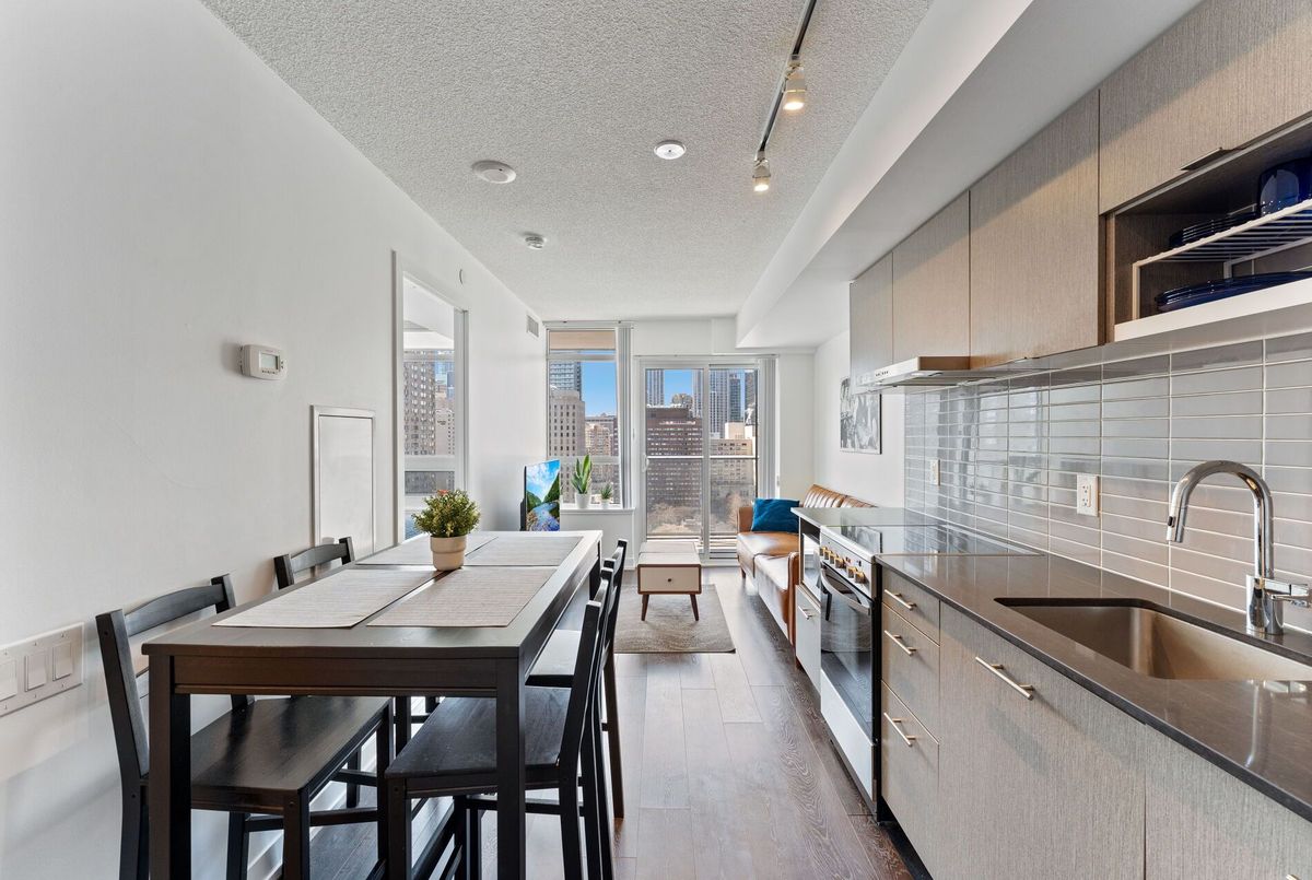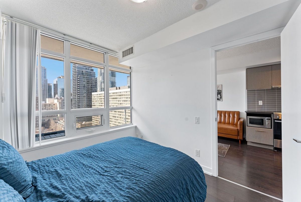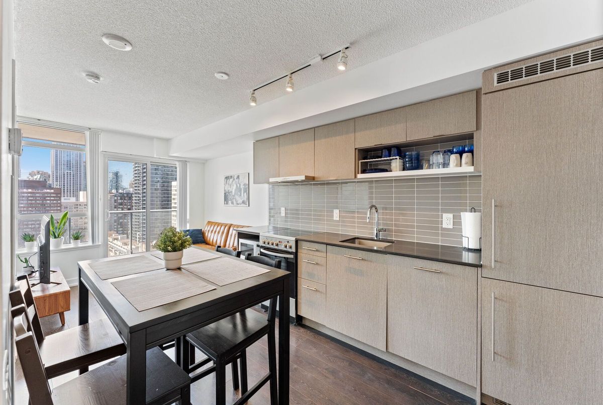 Experience upscale urban living in this stunning Menkes-built condo, ideally located in the heart of the city. This fully furnished bright, high-floor unit offers breathtaking unobstructed west-facing views, including a view of the CN Tower, all from a spacious private balcony. Thoughtfully designed with a highly functional layout and no wasted space, this unit features a separate den-perfect as a home office or guest room-and a generously sized bedroom with ample closet space. Situated in a modern building (approximately 5 years old) with no carpet throughout, this condo offers both style and convenience. Enjoy unbeatable walkability to universities, hospitals, Eaton Centre, subway stations, Loblaws, shops, restaurants, parks, and more. All utilities are included in the rent!!! Residents have access to exceptional amenities, including 24-hour concierge service, a fully equipped gym, party/meeting room. A perfect blend of comfort, convenience, and city living.