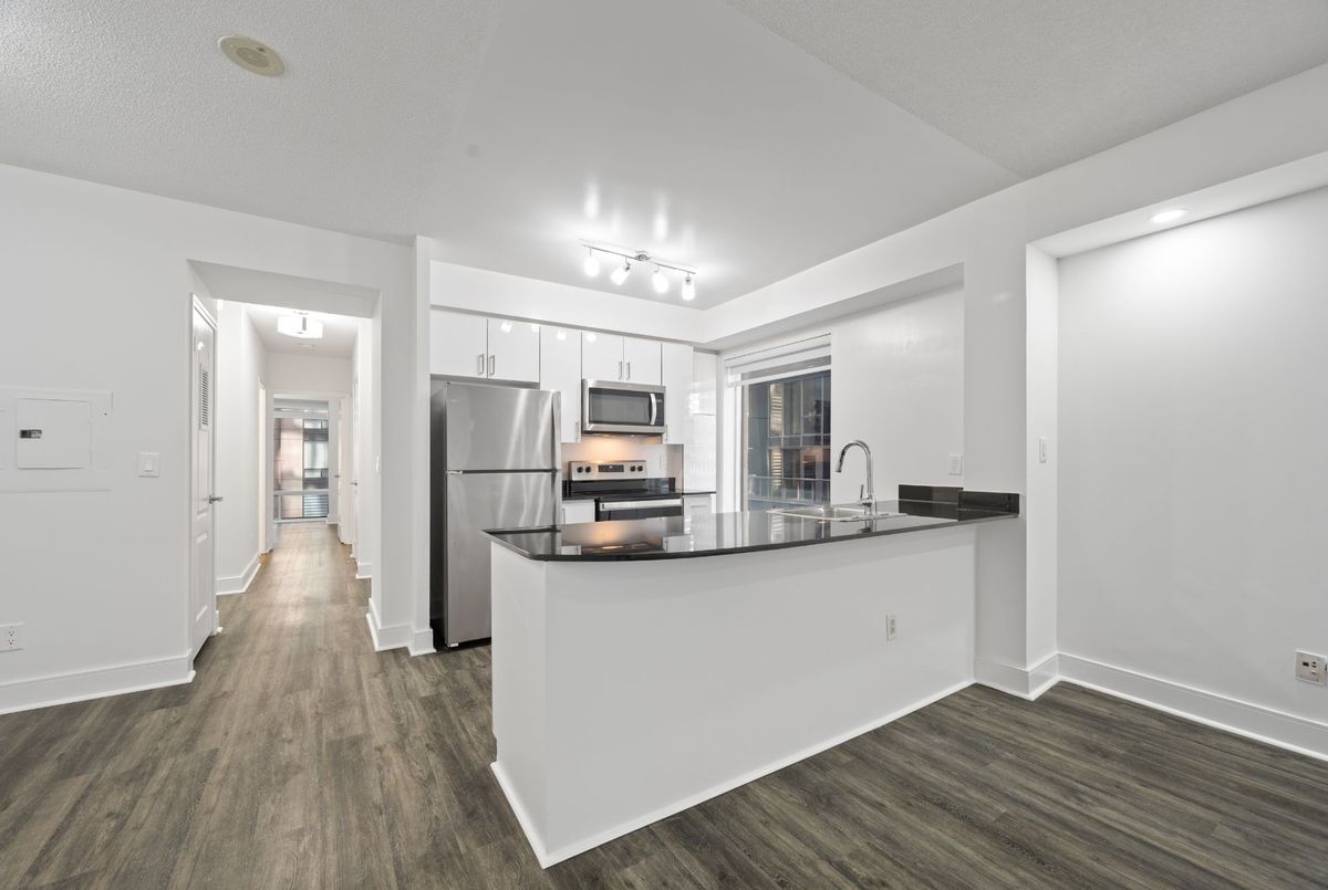 This spacious Two-Bedroom corner suite offers 970 square feet of thoughtfully designed living space. The open-concept kitchen features a breakfast bar that seamlessly connects to the living and dining areas. Additional highlights include an ensuite bathroom, two closets in the primary bedroom, and vinyl flooring throughout. Residents can enjoy a variety of amenities, including a concierge, gym, and a rooftop terrace with BBQs, along with a party room and lounge, movie theatre, and golf simulator for added entertainment. Situated in the heart of the city, this property offers unmatched proximity to the subway, Financial District, Entertainment District, and the lively neighbourhoods of King and Queen West, with easy access to the Gardiner Expressway. Experience Toronto's finest restaurants, theatre, shopping, and vibrant city life right at your doorstep!