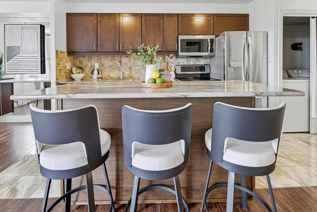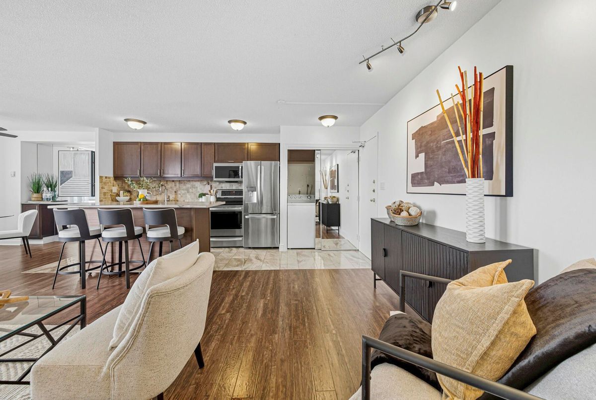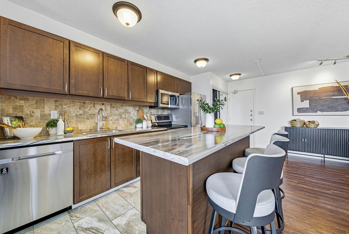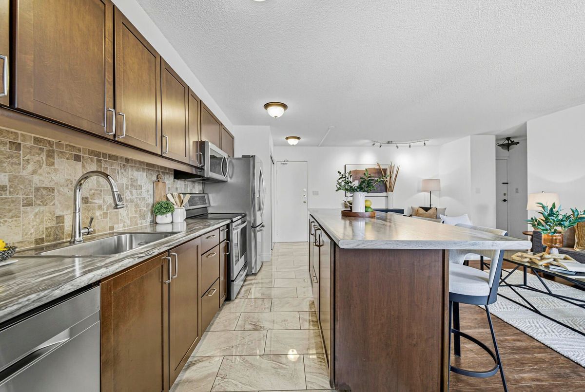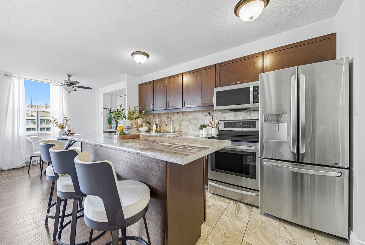 Urban Living in West Hill! Bright and spacious 2-bedroom condo with 2-door entrance, open-concept living and dining with laminate floors, walkout to a private balcony with stunning views, and a modern eat-in kitchen featuring a custom centre island, stylish marble backsplash, porcelain floor, stainless steel appliances, and large windows for natural light. Two good-sized bedrooms with laminate floors and sliding closets. Enjoy a full suite of amenities: gym, sauna, outdoor pool, tennis court, party room, bike storage, and ample visitor parking. The heating is hydronic, and the circulating water is heated with common gas-fired boilers. Maintenance fees include cable TV, heat, water, parking, and building insurance for worry-free living. Located in the heart of West Hill, steps to parks, schools, shopping, and transit with easy highway access.