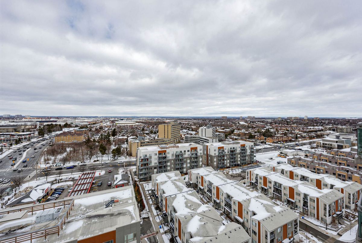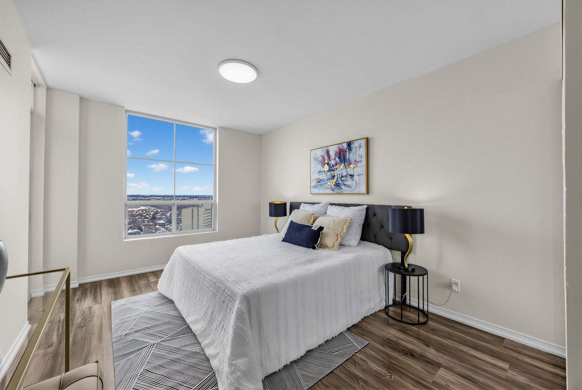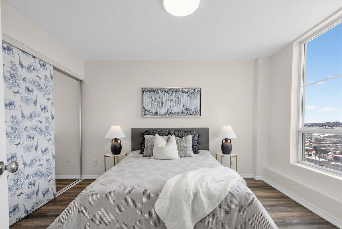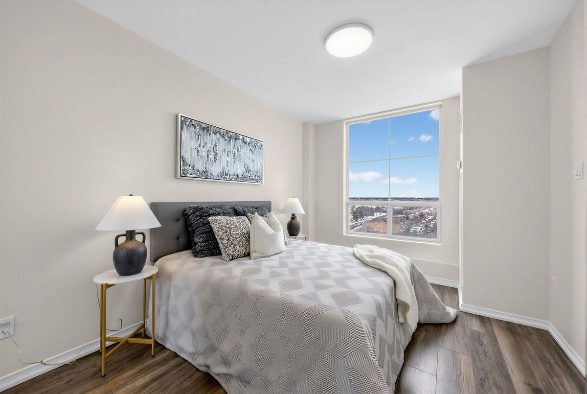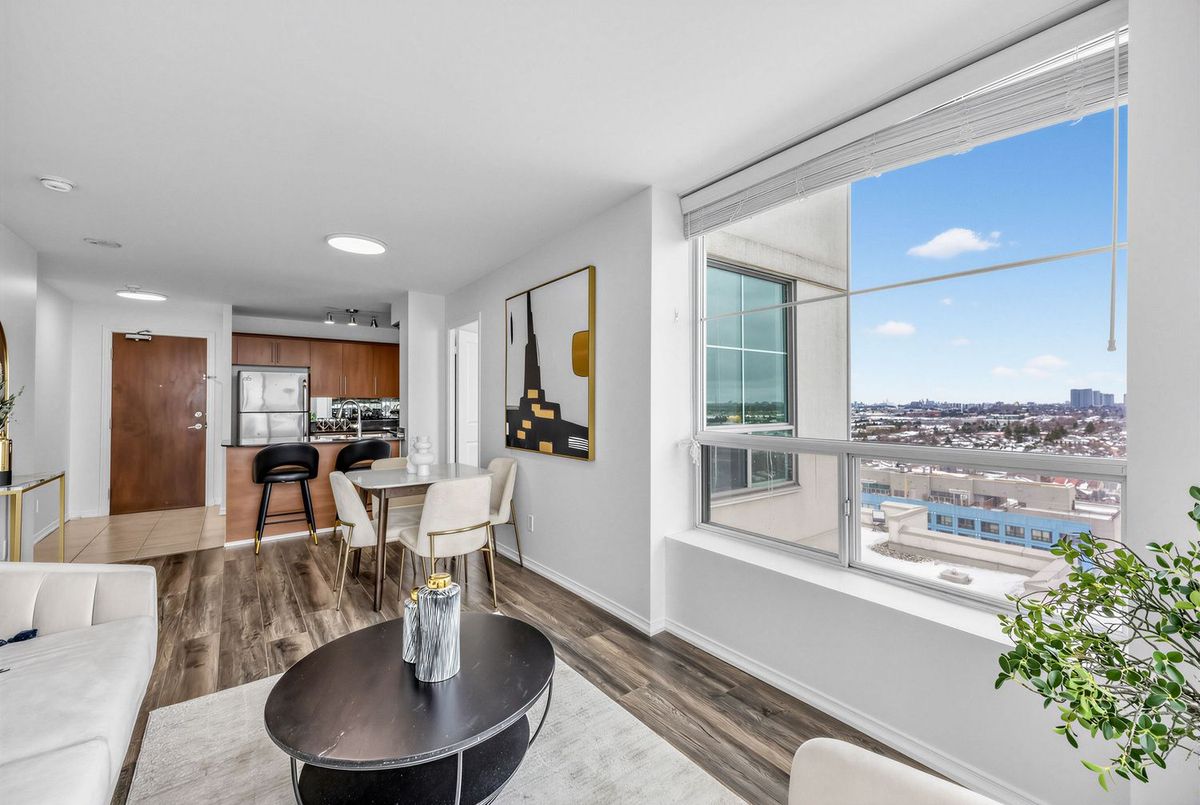 Bright penthouse corner unit at 6 Rosebank Drive offering unobstructed north and west views, beautiful sunsets, and excellent natural light throughout. Freshly painted, professionally cleaned, and truly move-in ready. This rare corner layout provides added privacy and a spacious open north-west facing balcony perfect for relaxing evenings. The modern kitchen features stainless steel appliances, granite countertops, glass backsplash, and a convenient breakfast bar overlooking the living space. The large open-concept living and dining area is filled with light from floor-to-ceiling windows and offers walkout access to the balcony. Laminate flooring runs throughout the living areas and bedrooms. The spacious primary bedroom easily fits a king-size bed and includes floor-to-ceiling windows, a 4-piece ensuite, and generous closet space. The second bedroom is well sized with a large closet and a bright north-facing window. Includes two full washrooms and one parking spot. Located in a convenient Scarborough community close to Hwy 401, TTC, and Agincourt GO Station, with easy access to Scarborough Town Centre, grocery stores, restaurants, parks, and schools including White Haven PS and Agincourt Collegiate. A fantastic opportunity for young couples or young families seeking space, privacy, and convenience in a well-connected neighbourhood.