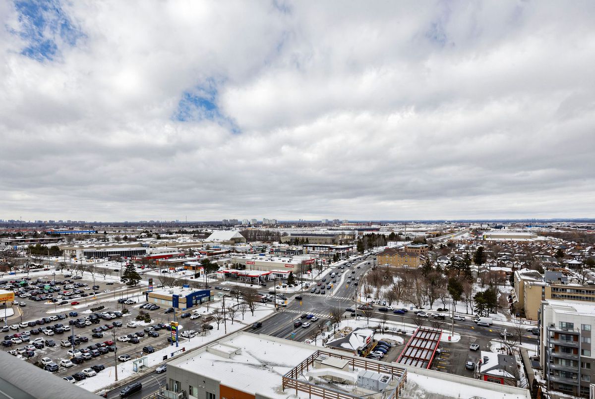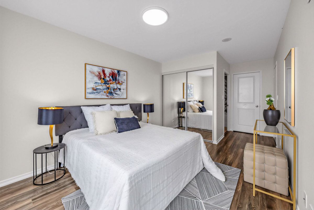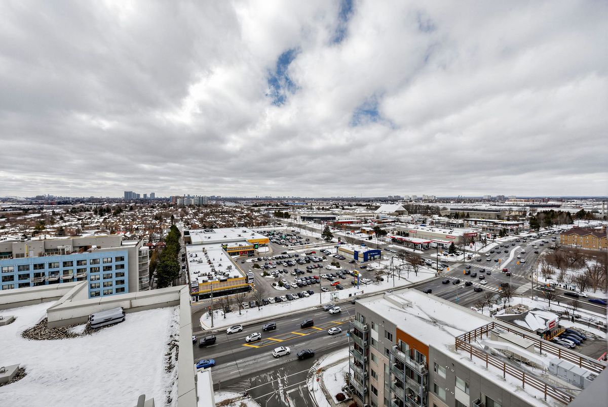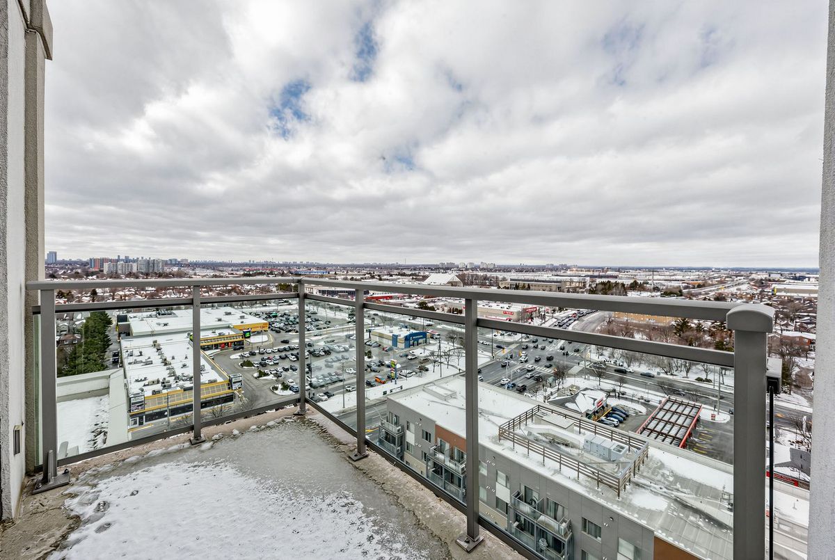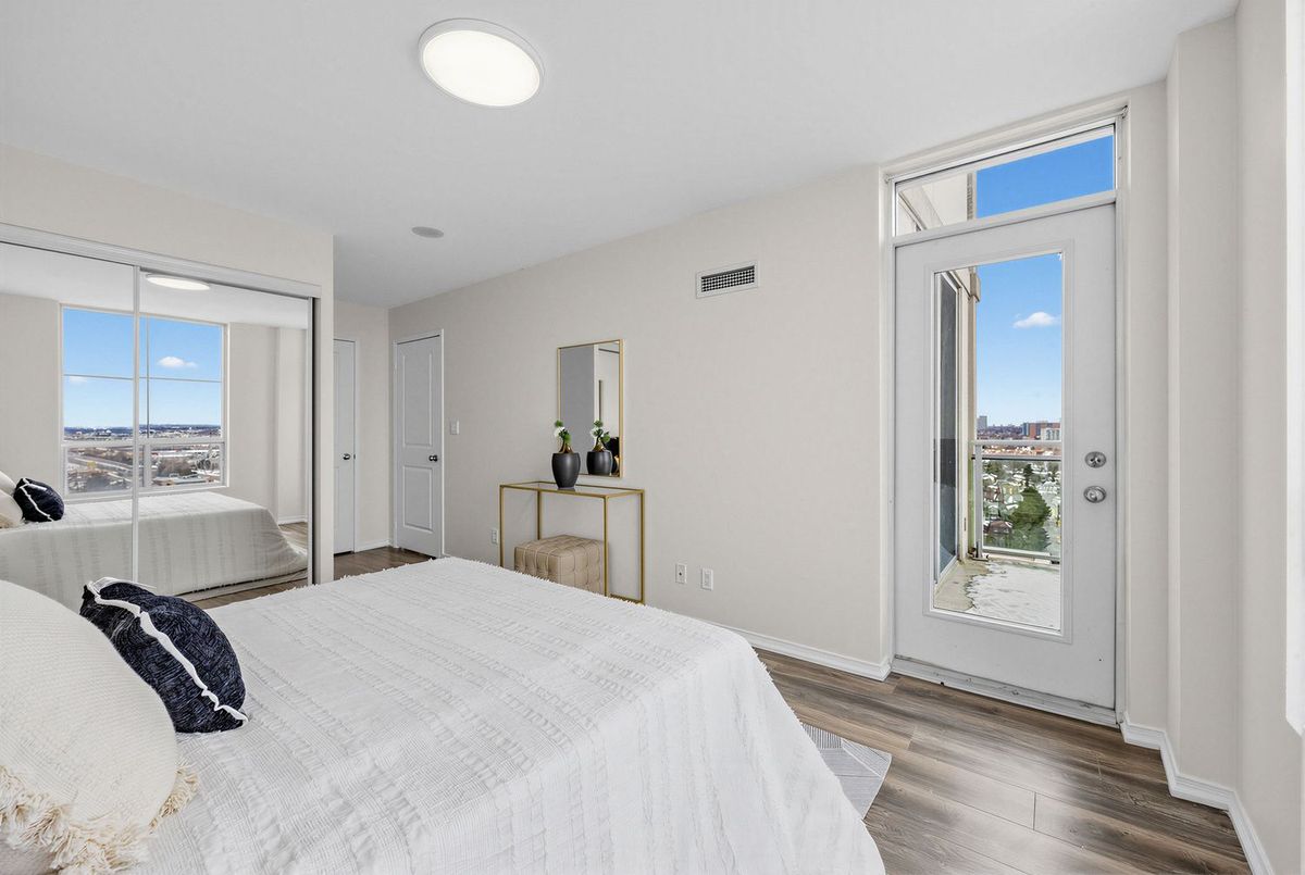 Bright penthouse corner unit at 6 Rosebank Drive offering unobstructed north and west views, beautiful sunsets, and excellent natural light throughout. Freshly painted, professionally cleaned, and truly move-in ready. This rare corner layout provides added privacy and a spacious open north-west facing balcony perfect for relaxing evenings. The modern kitchen features stainless steel appliances, granite countertops, glass backsplash, and a convenient breakfast bar overlooking the living space. The large open-concept living and dining area is filled with light from floor-to-ceiling windows and offers walkout access to the balcony. Laminate flooring runs throughout the living areas and bedrooms. The spacious primary bedroom easily fits a king-size bed and includes floor-to-ceiling windows, a 4-piece ensuite, and generous closet space. The second bedroom is well sized with a large closet and a bright north-facing window. Includes two full washrooms and one parking spot. Located in a convenient Scarborough community close to Hwy 401, TTC, and Agincourt GO Station, with easy access to Scarborough Town Centre, grocery stores, restaurants, parks, and schools including White Haven PS and Agincourt Collegiate. A fantastic opportunity for young couples or young families seeking space, privacy, and convenience in a well-connected neighbourhood.