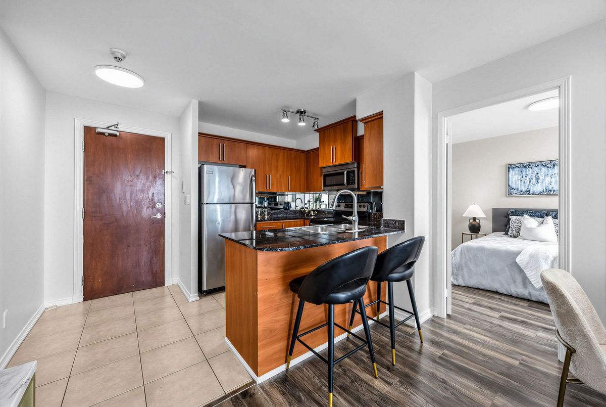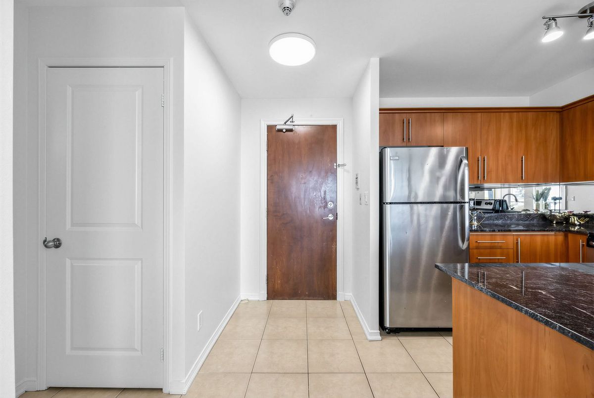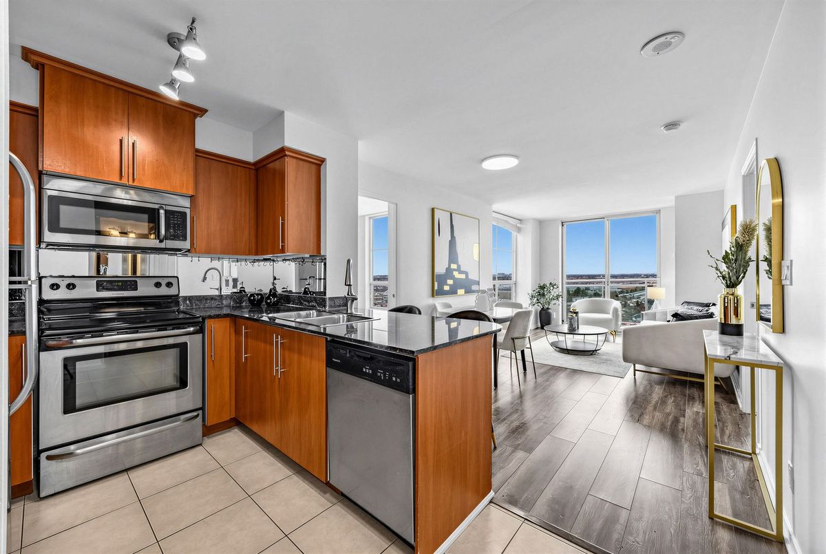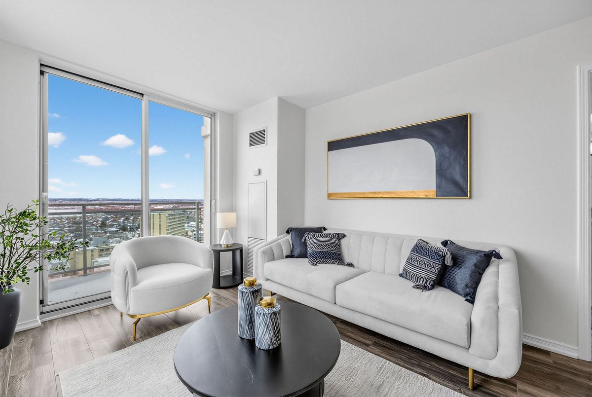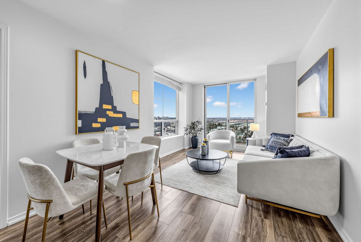 Bright penthouse corner unit at 6 Rosebank Drive offering unobstructed north and west views, beautiful sunsets, and excellent natural light throughout. Freshly painted, professionally cleaned, and truly move-in ready. This rare corner layout provides added privacy and a spacious open north-west facing balcony perfect for relaxing evenings. The modern kitchen features stainless steel appliances, granite countertops, glass backsplash, and a convenient breakfast bar overlooking the living space. The large open-concept living and dining area is filled with light from floor-to-ceiling windows and offers walkout access to the balcony. Laminate flooring runs throughout the living areas and bedrooms. The spacious primary bedroom easily fits a king-size bed and includes floor-to-ceiling windows, a 4-piece ensuite, and generous closet space. The second bedroom is well sized with a large closet and a bright north-facing window. Includes two full washrooms and one parking spot. Located in a convenient Scarborough community close to Hwy 401, TTC, and Agincourt GO Station, with easy access to Scarborough Town Centre, grocery stores, restaurants, parks, and schools including White Haven PS and Agincourt Collegiate. A fantastic opportunity for young couples or young families seeking space, privacy, and convenience in a well-connected neighbourhood.