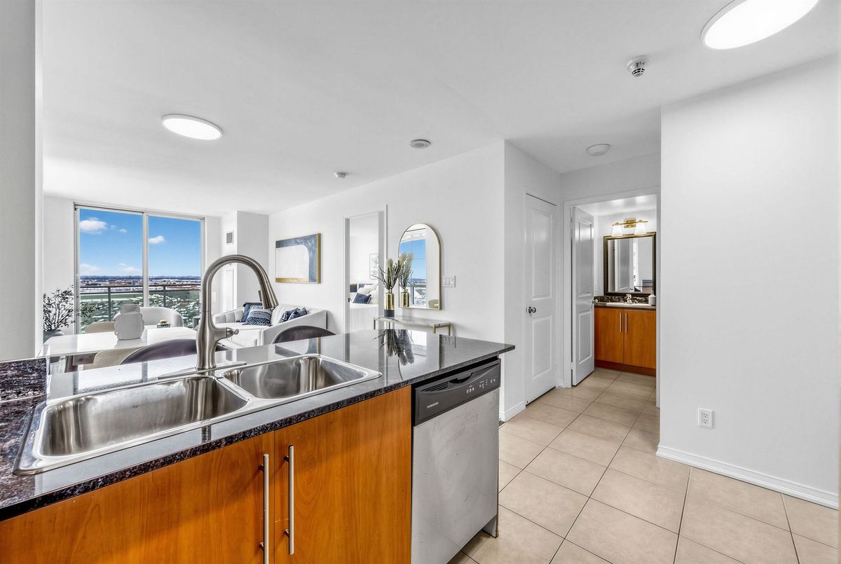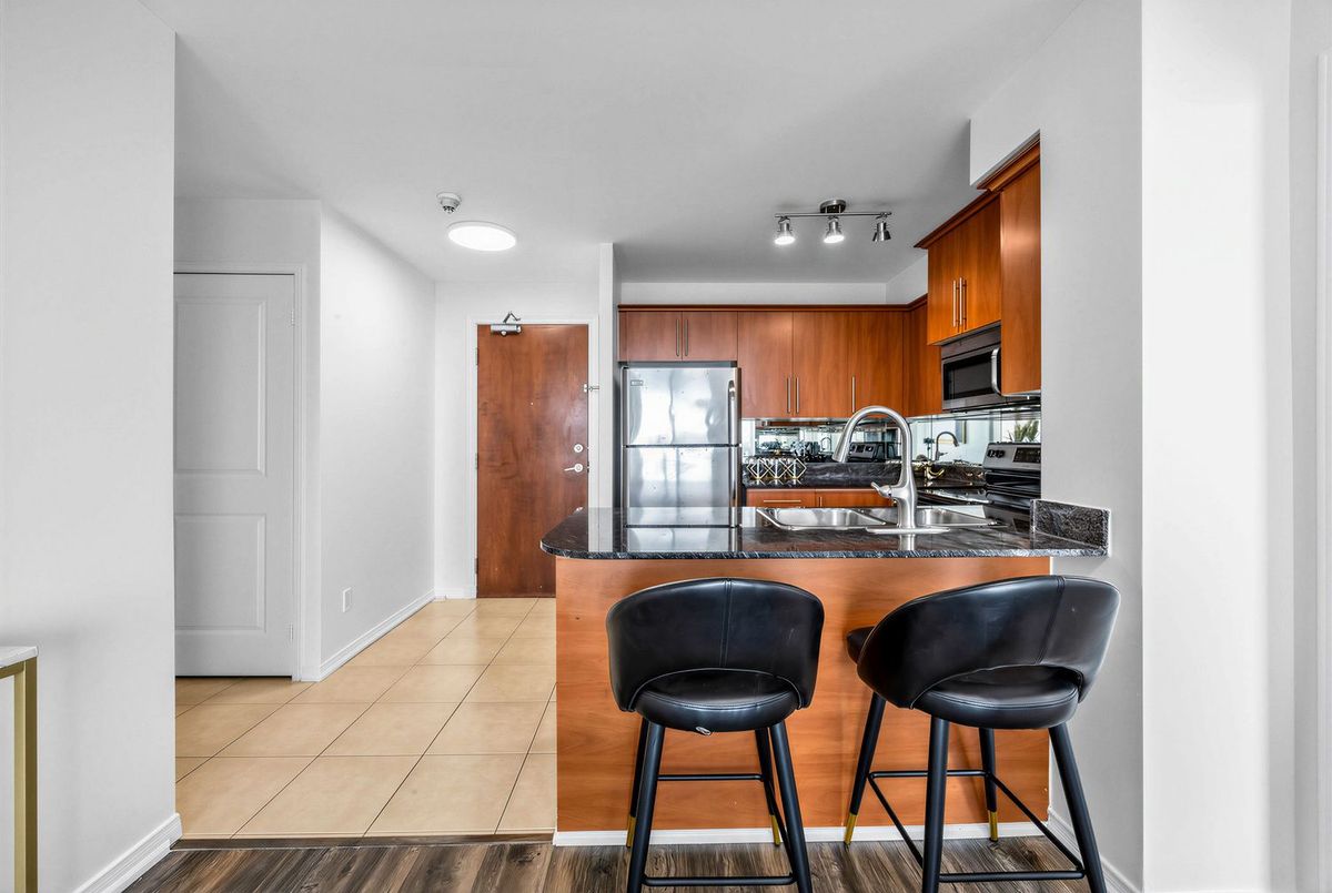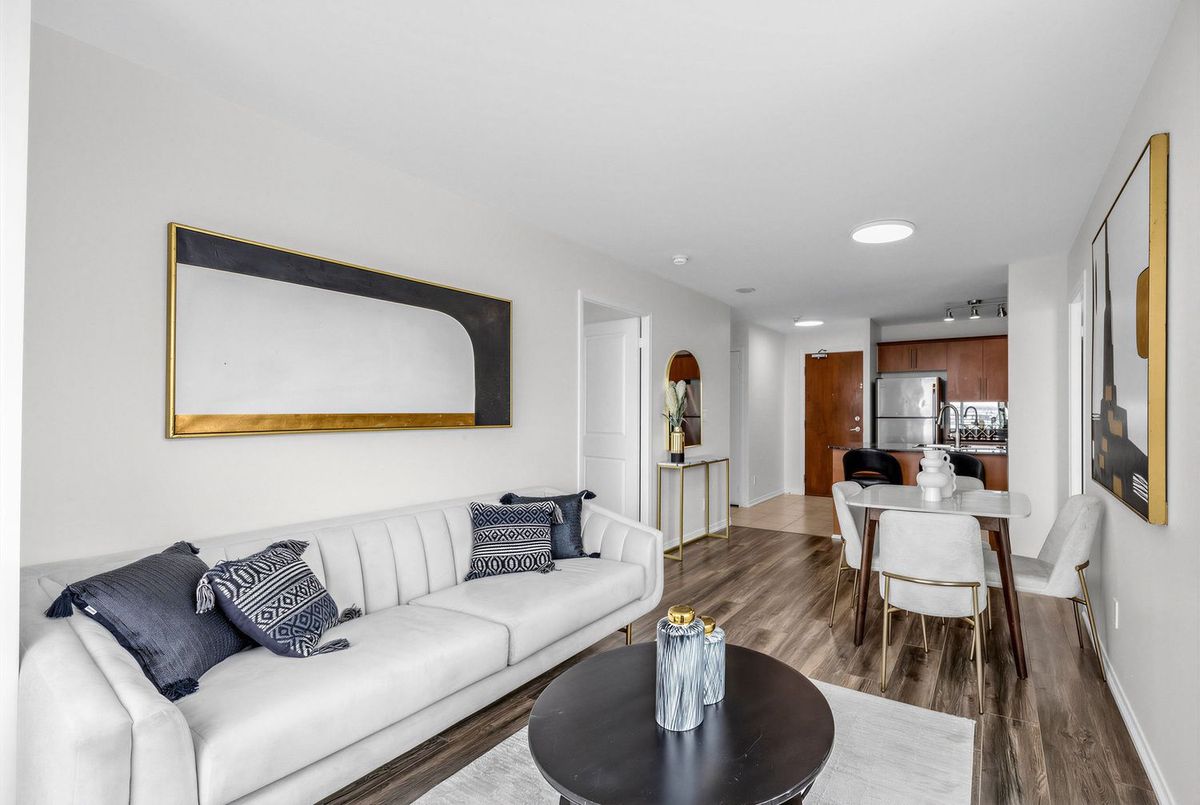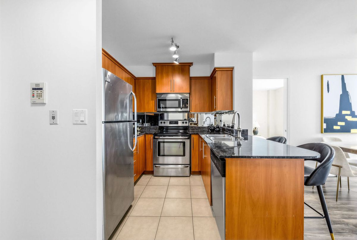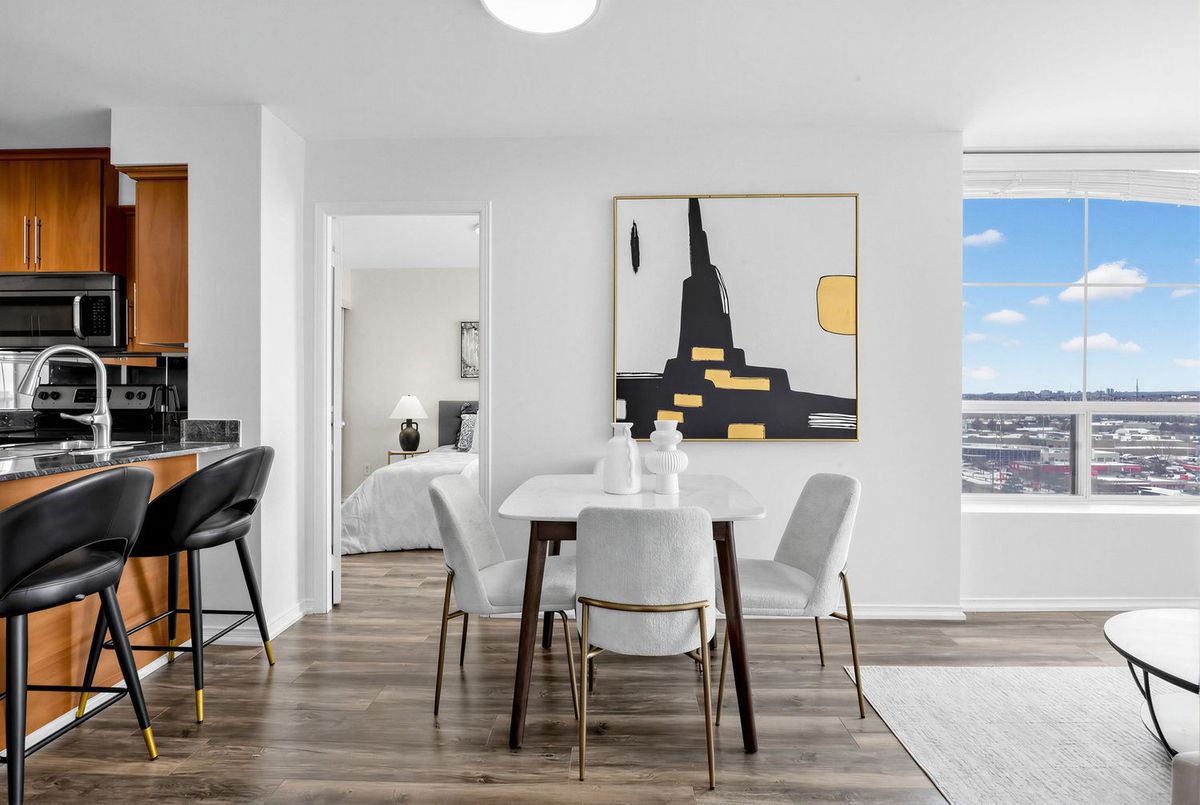 Bright penthouse corner unit at 6 Rosebank Drive offering unobstructed north and west views, beautiful sunsets, and excellent natural light throughout. Freshly painted, professionally cleaned, and truly move-in ready. This rare corner layout provides added privacy and a spacious open north-west facing balcony perfect for relaxing evenings. The modern kitchen features stainless steel appliances, granite countertops, glass backsplash, and a convenient breakfast bar overlooking the living space. The large open-concept living and dining area is filled with light from floor-to-ceiling windows and offers walkout access to the balcony. Laminate flooring runs throughout the living areas and bedrooms. The spacious primary bedroom easily fits a king-size bed and includes floor-to-ceiling windows, a 4-piece ensuite, and generous closet space. The second bedroom is well sized with a large closet and a bright north-facing window. Includes two full washrooms and one parking spot. Located in a convenient Scarborough community close to Hwy 401, TTC, and Agincourt GO Station, with easy access to Scarborough Town Centre, grocery stores, restaurants, parks, and schools including White Haven PS and Agincourt Collegiate. A fantastic opportunity for young couples or young families seeking space, privacy, and convenience in a well-connected neighbourhood.
