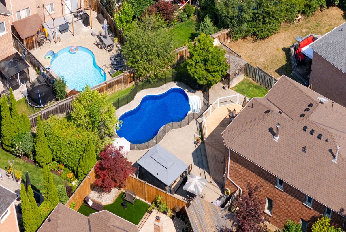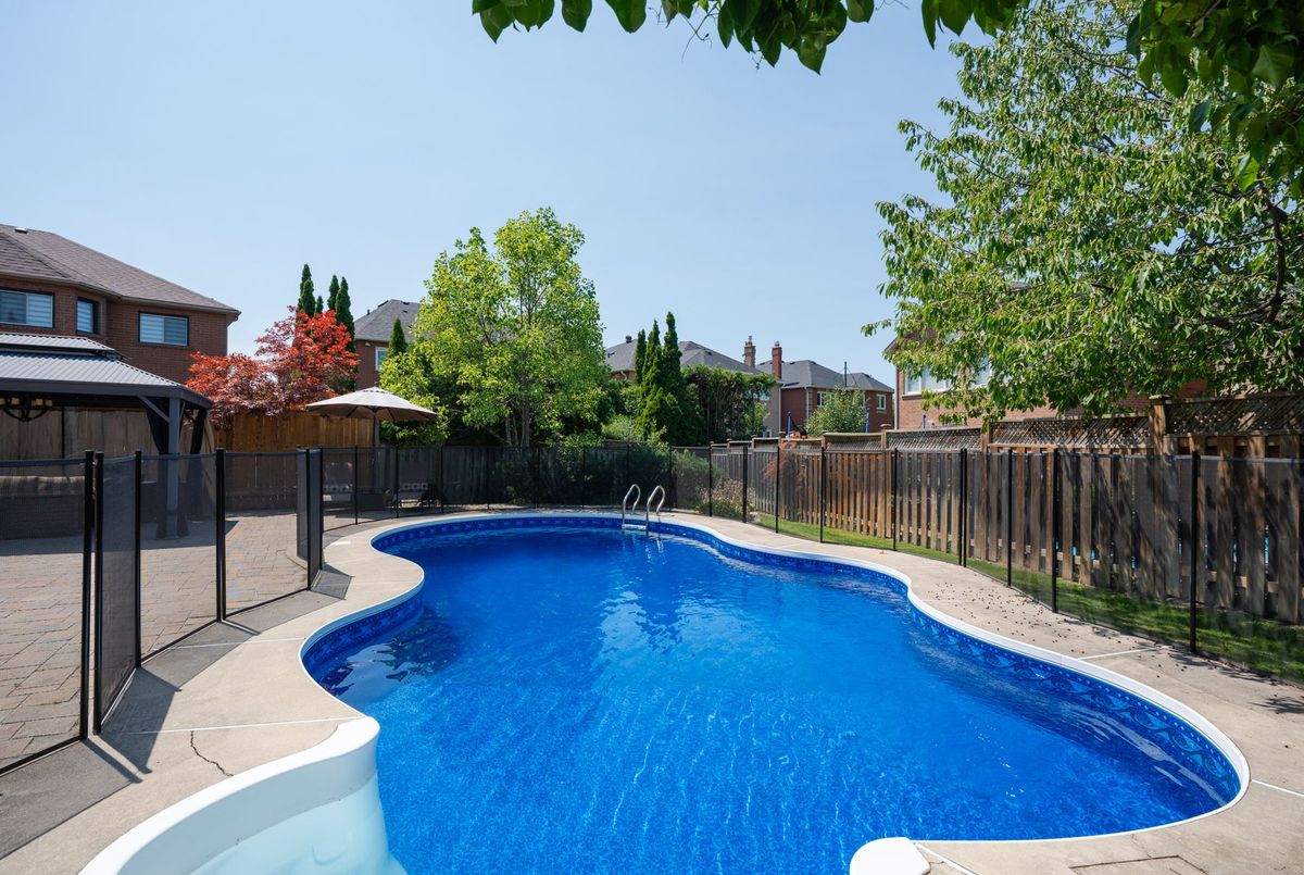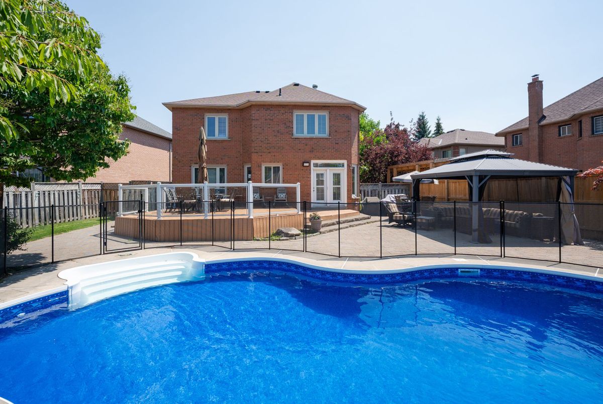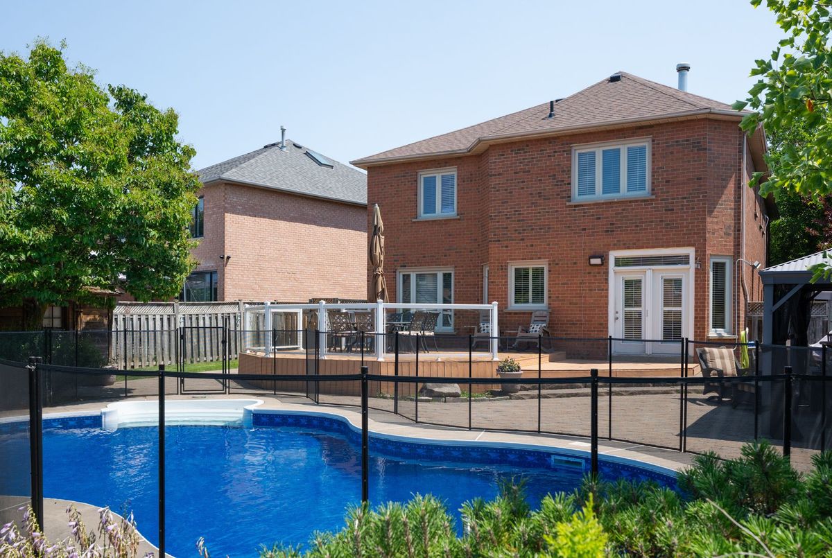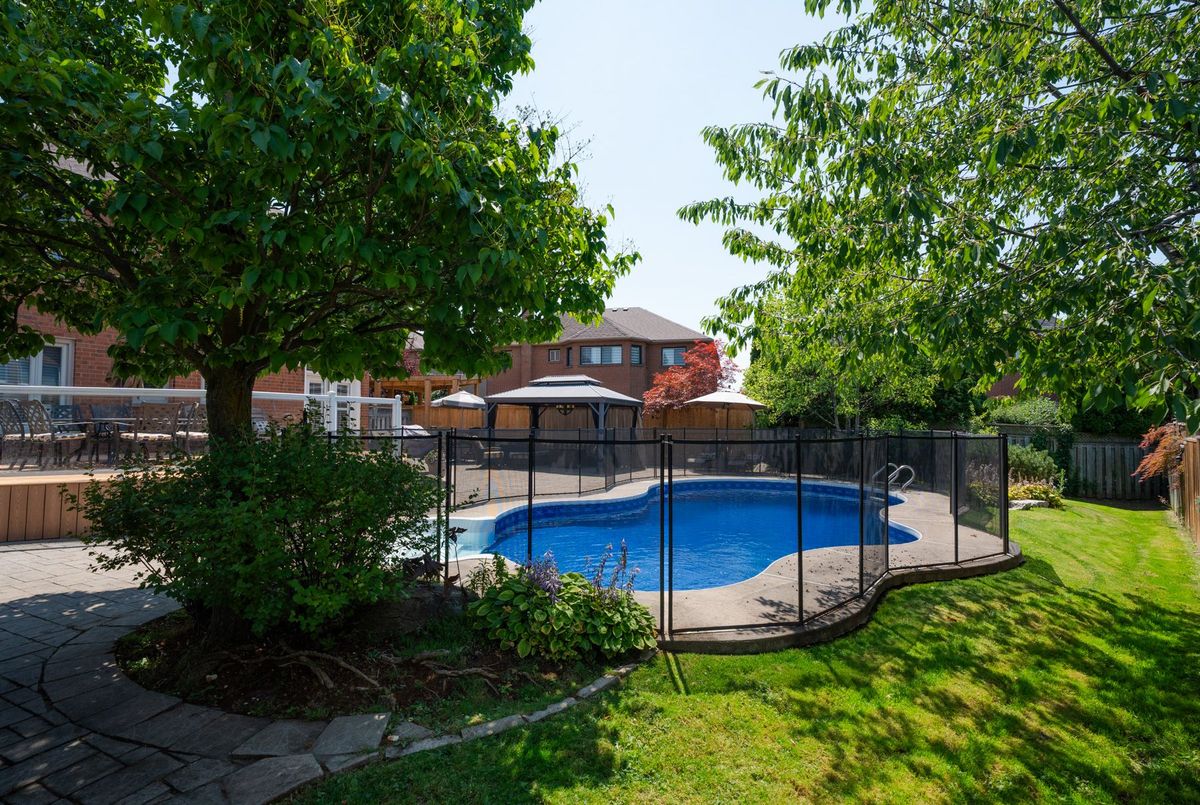 Tucked away on a quiet cul-de-sac, this 4-bedroom, 5-bathroom residence oers 3,450 sq.ft. of elegant living space on apremium pie-shaped lot. A 6-car parking, double garage, and professionally landscaped grounds with an in ground pool set the stage for bothconvenience and luxury. Inside, a grand foyer with chandelier, travertine floors, and wainscotting leads to a private oce with cathedralceiling, French doors, and built-in shelving. The formal living and dining rooms showcase hardwood, crown moulding, pot lights, and built-inspeakers. At the heart of the home, the chefs kitchen features a granite island with bar seating, stainless steel appliances, and granitecounters, open to the family room with a double-sided wood-burning fireplace. A powder room, laundry with garage access, and oak staircasewith wrought iron spindles complete the main level.Upstairs, the primary retreat impresses with a cathedral ceiling, walk-in closet, built-inshelving, mini split A/C, and a spa-like 6-pc ensuite with freestanding tub and rain shower.The second bedroom has its own 3-pc ensuite, whilethe third and fourth share a 5-pc bath.The finished basement oers versatile rec space, laminate flooring, and a 2-pc bath. Outside, enjoy aresort-style yard with oversized deck, pool (new liner 2025, hard cover, safety fence), gas heater, gazebo, and sprinkler system.Notableupgrades include roof (2024), pool liner (2025), 200 AMP panel, central vac, and lifetime window warranty. Ideally located near top-ratedschools, parks, trails, shopping, transit, and major highways this home combines elegance, function, and an entertainers dream setting.*Select photos may include digital staging for illustrative purposes*