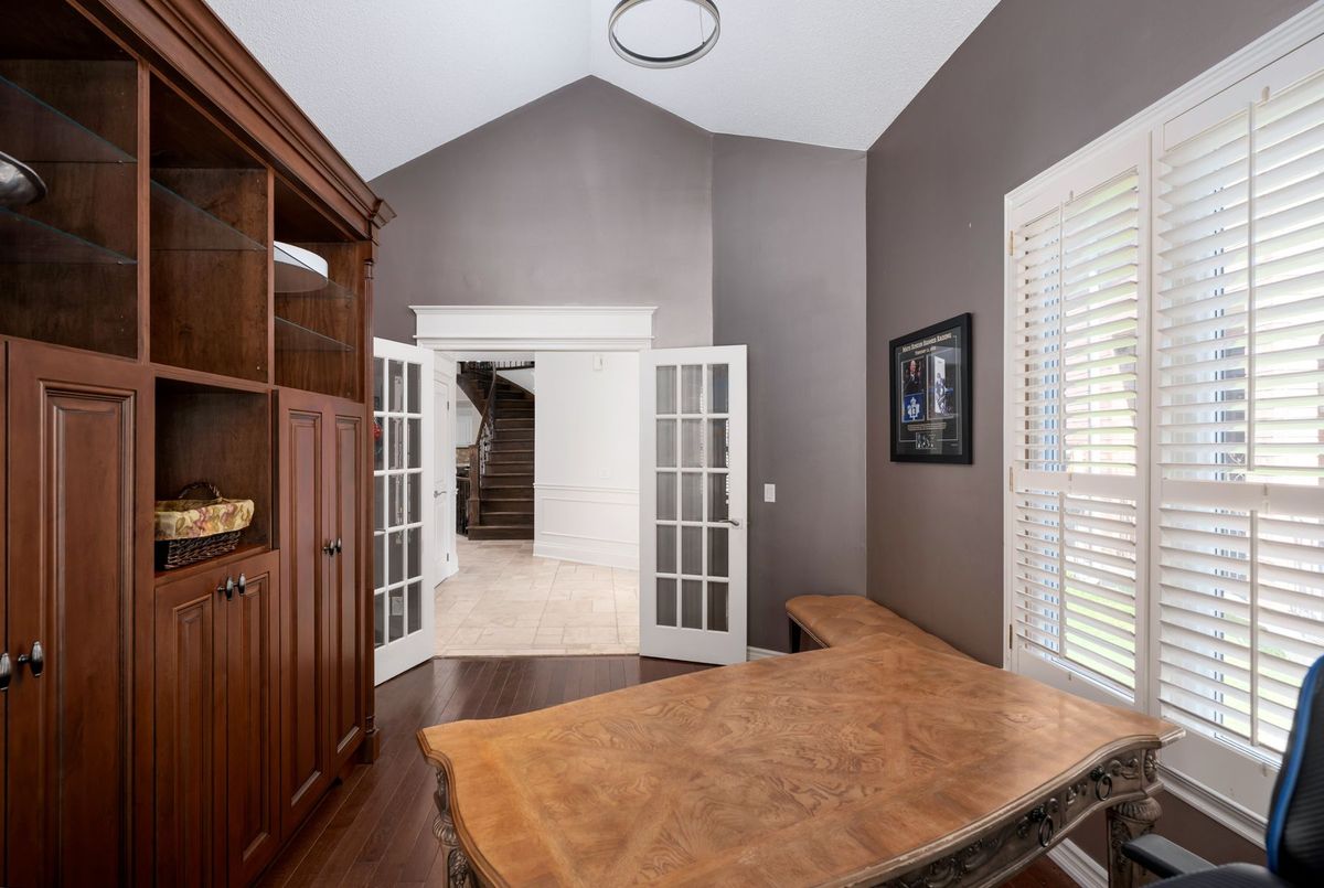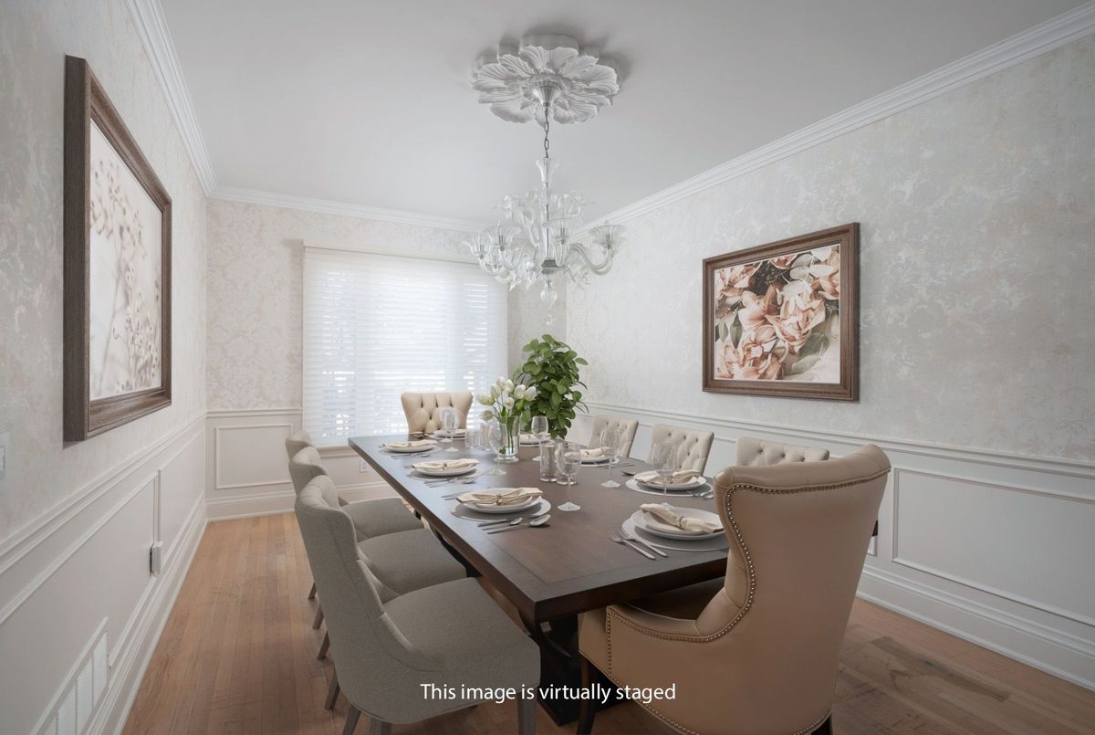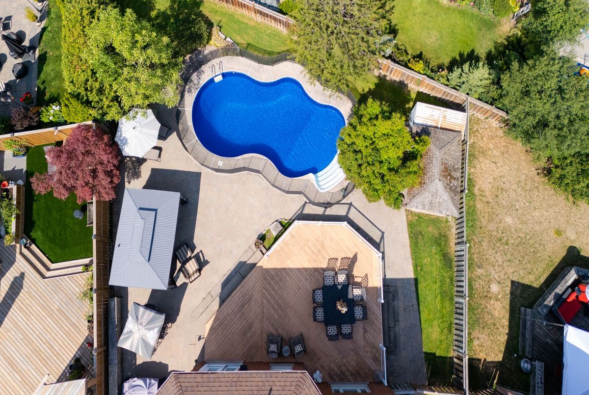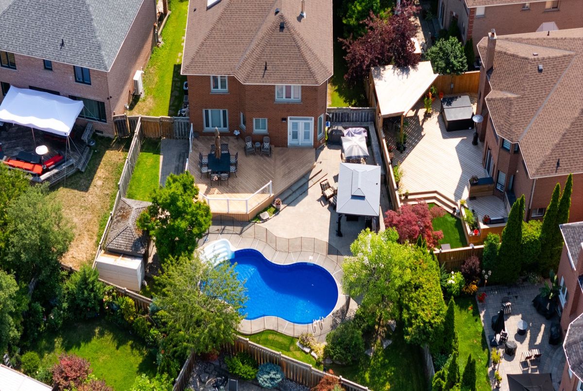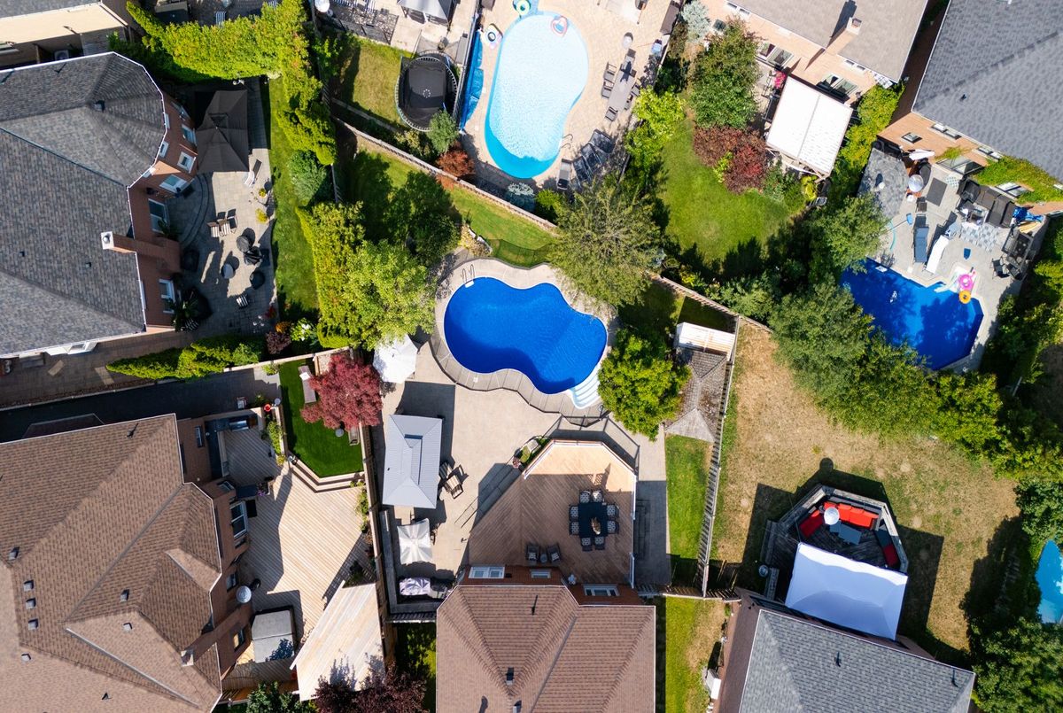 Tucked away on a quiet cul-de-sac, this 4-bedroom, 5-bathroom residence oers 3,450 sq.ft. of elegant living space on apremium pie-shaped lot. A 6-car parking, double garage, and professionally landscaped grounds with an in ground pool set the stage for bothconvenience and luxury. Inside, a grand foyer with chandelier, travertine floors, and wainscotting leads to a private oce with cathedralceiling, French doors, and built-in shelving. The formal living and dining rooms showcase hardwood, crown moulding, pot lights, and built-inspeakers. At the heart of the home, the chefs kitchen features a granite island with bar seating, stainless steel appliances, and granitecounters, open to the family room with a double-sided wood-burning fireplace. A powder room, laundry with garage access, and oak staircasewith wrought iron spindles complete the main level.Upstairs, the primary retreat impresses with a cathedral ceiling, walk-in closet, built-inshelving, mini split A/C, and a spa-like 6-pc ensuite with freestanding tub and rain shower.The second bedroom has its own 3-pc ensuite, whilethe third and fourth share a 5-pc bath.The finished basement oers versatile rec space, laminate flooring, and a 2-pc bath. Outside, enjoy aresort-style yard with oversized deck, pool (new liner 2025, hard cover, safety fence), gas heater, gazebo, and sprinkler system.Notableupgrades include roof (2024), pool liner (2025), 200 AMP panel, central vac, and lifetime window warranty. Ideally located near top-ratedschools, parks, trails, shopping, transit, and major highways this home combines elegance, function, and an entertainers dream setting.*Select photos may include digital staging for illustrative purposes*