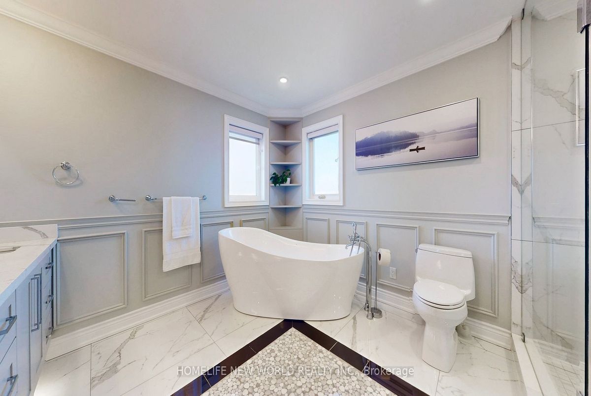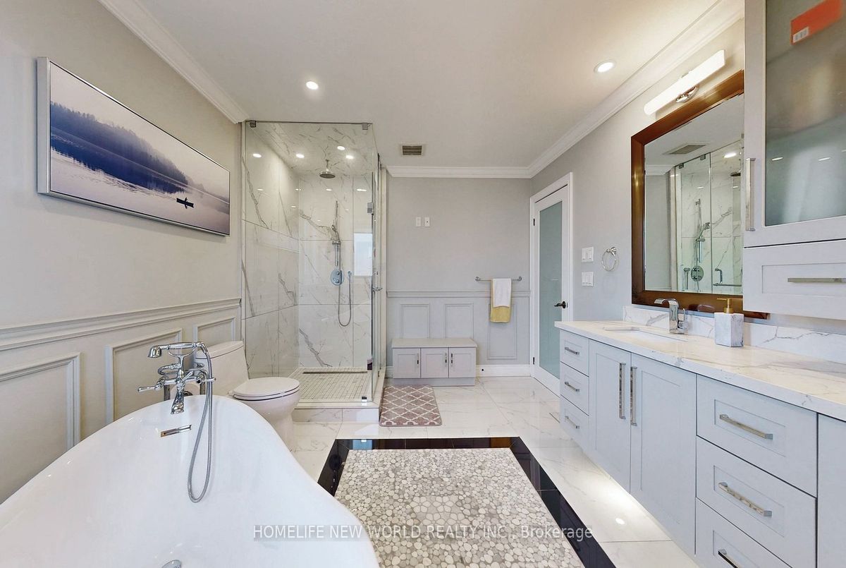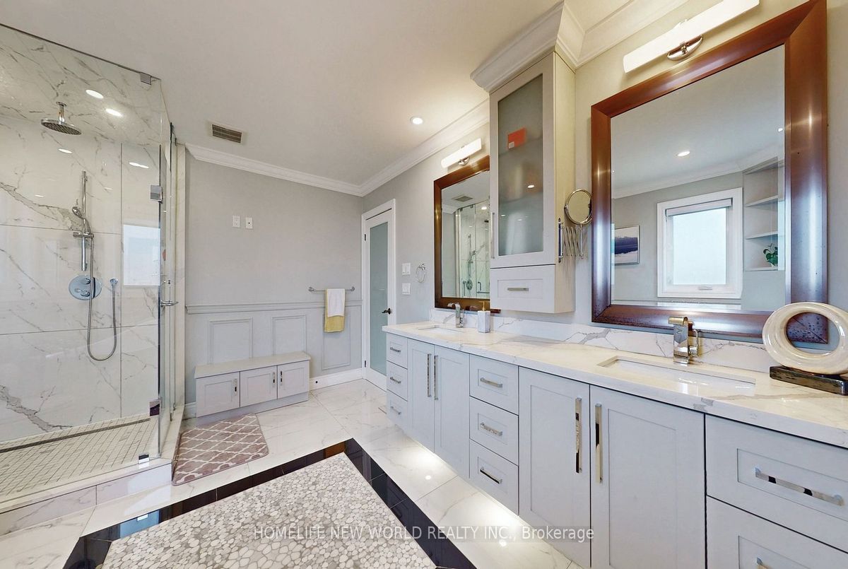 3 Garages Stone Front Mansion In Prime Area Of Markham Around 4400 SQ FT Plus near 2000 SQ FT Finished Basment . 9 Ft Ceiling , 5 bedroom 5 en-suite with a sitting area in the second Floor huge bright sky Light. all en-suite recent updated . 18 ft open to above family with bay window . Professional recent updated high ceiling open concept Basement with gym, entertainment room Ballard room guess room , bar . Separated entrance to main floor Office ...very well kept House , must come and see .