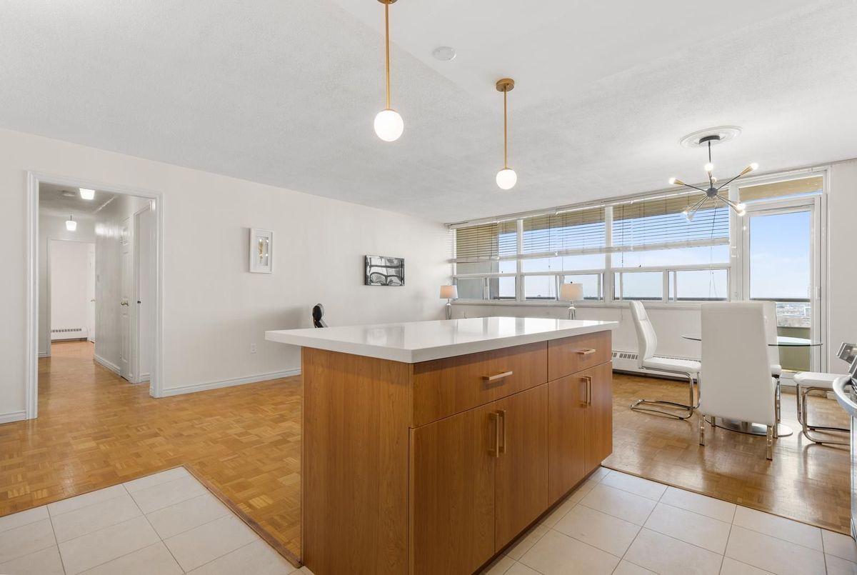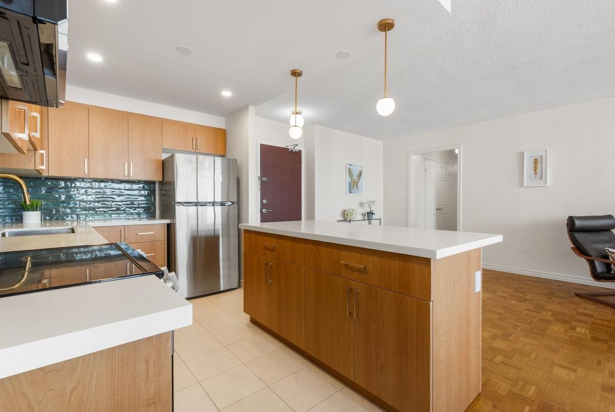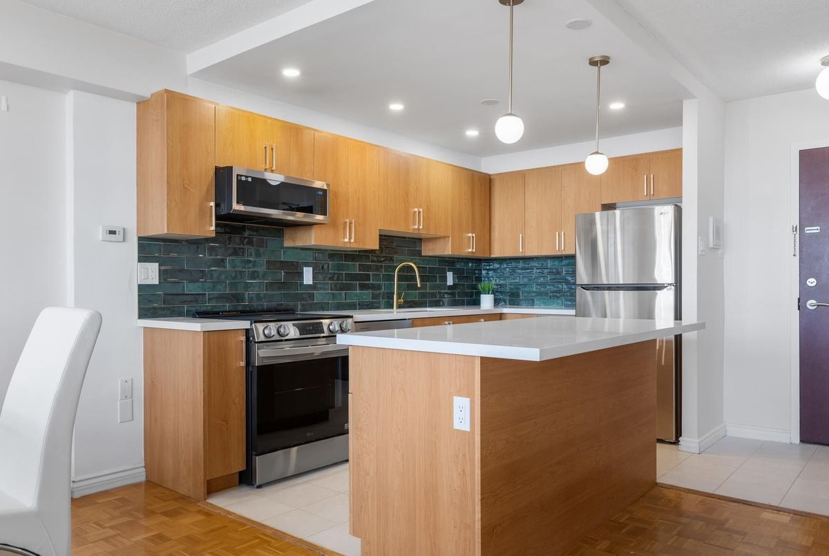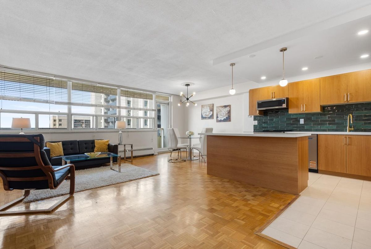 Rare affordable family-sized home in Toronto! This spacious 3-bedroom corner unit offers Southwest exposure with a large balcony, perfect for enjoying breathtaking sunsets. The newly renovated, open-concept kitchen is truly one-of-a-kind in the building, designed to impress with its modern layout., featuring high-end limestone flooring, a hand-painted Italian tile backsplash, island with bar-like overhang, and all-new appliances, seamlessly blending style and functionality. The open-concept living and dining areas provide an inviting space for entertaining. From the balcony, you can take in a wide city view all the way to the Lake and the Escarpment. Generously sized bedrooms with large windows ensure an abundance of natural light throughout. Newly renovated ensuite bathroom in the primary. Great value for all-inclusive maintenance fees, includes building gym, indoor pool, sauna, rooftop deck, library/reading room, heat, hydro, water, cable tv and high-speed internet, on-site storage locker and underground parking. Located in a prime area, just steps from shops, restaurants, and transit, including a walkway gate to Glencairn Subway Station, walking distance to Eglinton West Station, and the upcoming Cedarvale Station on the Eglinton LRT. Easy access to Allen Road, Hwy 401, parks, and the Kay Gardner Trail makes this an unbeatable location.
