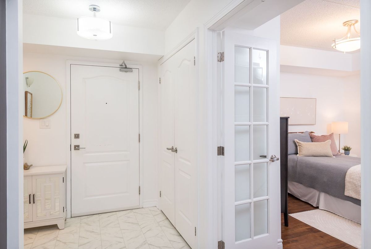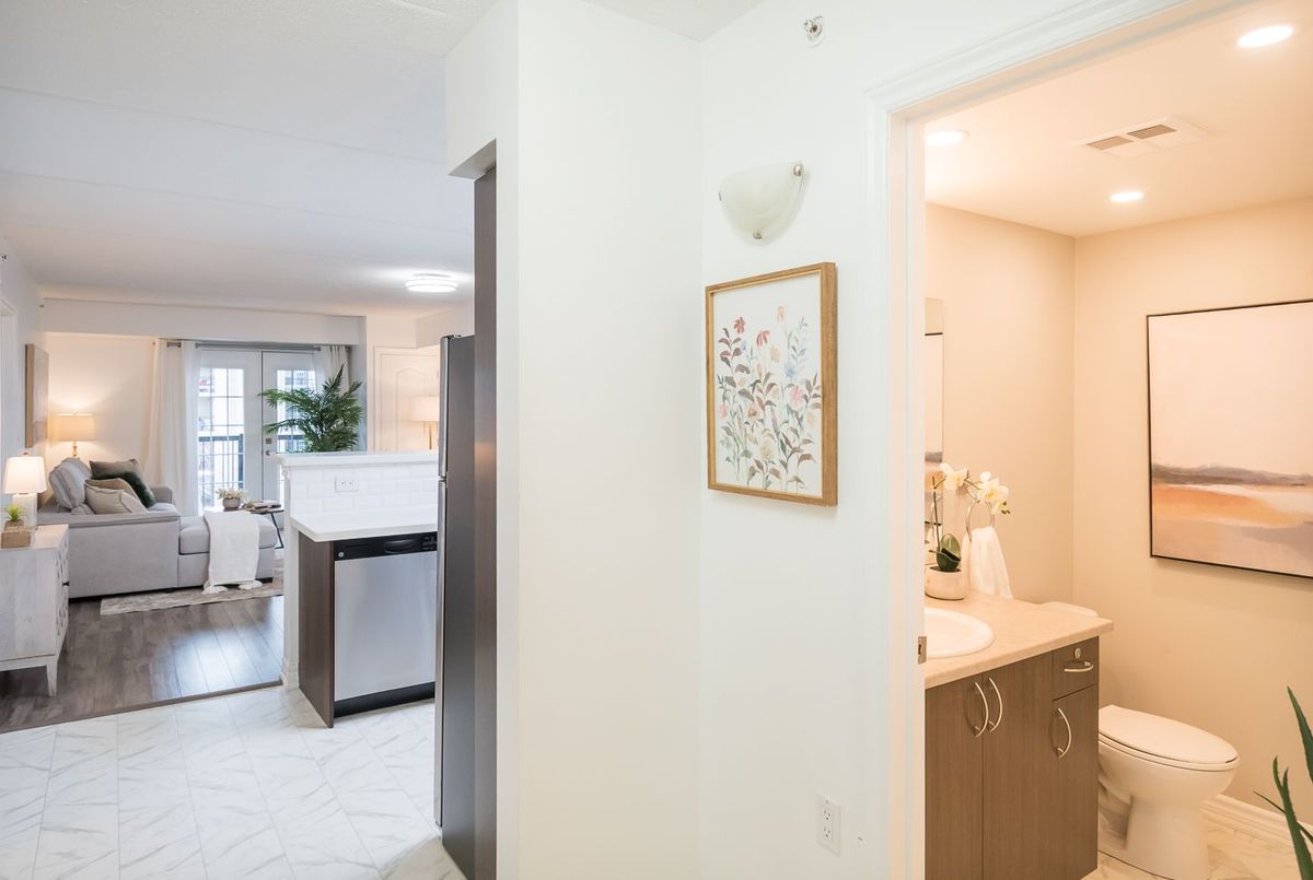 This stylish condo at Courtyards on Main offers an uncommon blend of space and practicality - approximately 920 sq ft of thoughtfully designed living space, a spacious balcony & two bathrooms. The bright open-concept design features a modern kitchen with quartz countertops, white subway tile backsplash, stainless steel appliances, and a breakfast bar, with direct access from the living space to the balcony for seamless indoor-outdoor living. The open living and dining area showcases laminate flooring, upgraded lighting, and a neutral palette throughout. The generously sized primary bedroom includes a walk-in closet and private 4-piece ensuite. A separate den with French doors offers true flexibility as a home office or guest space, while the added 2-piece powder room provides everyday convenience rarely found in this category. Complete with in-suite laundry and ideally located within walking distance to parks, schools, and everyday amenities, with quick access to Highways 401 and 407 - this is condo living without compromise.
