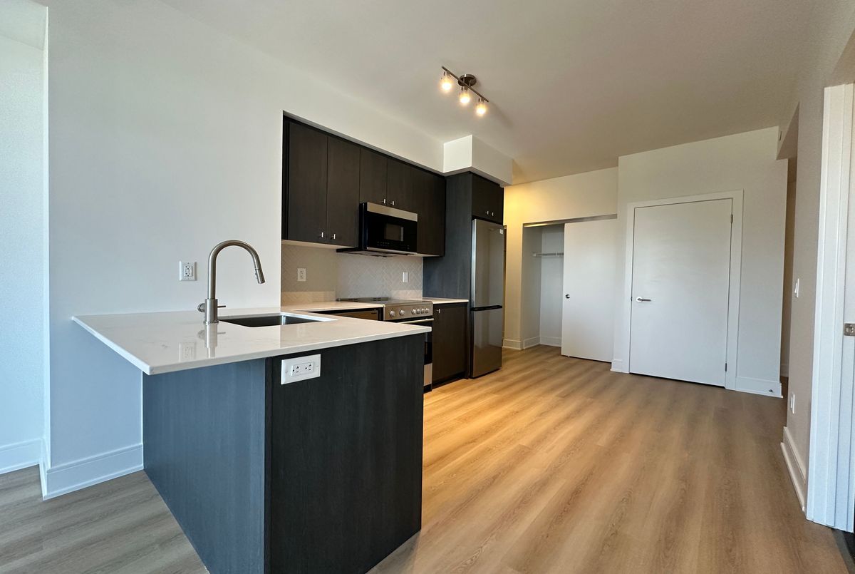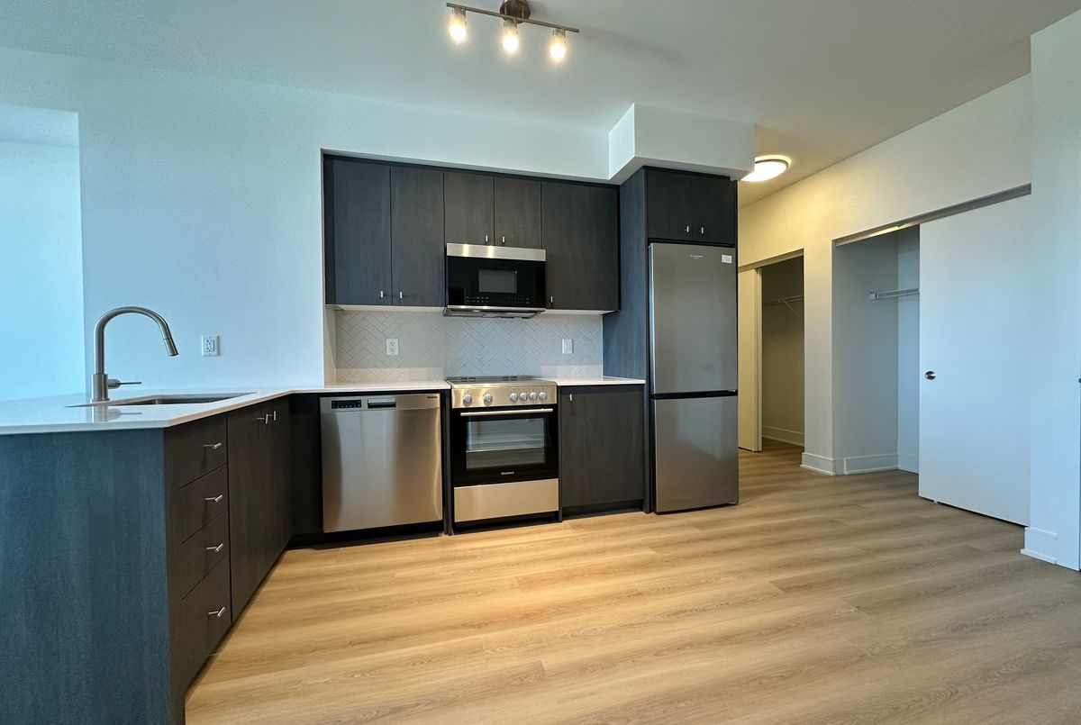 Opportunity to live in the brand new unit that has it all!! Spacious 1 Bed + Den suite at DUO Tower C, Station Park. 668 sf interior + 116 Sq ft oversized balcony. Open living/dining with modern kitchen featuring quartz counters & stainless steel appliances. Primary bedroom features walk out access to a large double-sized balcony. Den offers ideal work-from-home flexibility and is large enough to be utilized as a room in itself. Enjoy full-height windows and w/o to open balcony for beautiful, uninterrupted views of the city. The unit includes blinds and is move-in ready. Centrally located in the Innovation District, Station Park is home to some of the most unique amenities in a local development. Union Towers at Station Park offers residents a variety of luxury amenity spaces for all to enjoy. Amenities include a two-lane bowling alley with a lounge; a premier lounge area with bar, a pool table and foosball; a private hydro-pool swim spa & hot tub, a fitness area with gym equipment, a yoga/Pilates studio & Peloton studio, a dog washing station/pet spa, a landscaped outdoor terrace with cabana seating and BBQs; a concierge desk for resident support, and a private bookable dining room with kitchen appliances, a dining table, and lounge chairs. Many other indoor/outdoor amenities are planned for the future, such as an outdoor skating rink and ground-floor restaurants.
