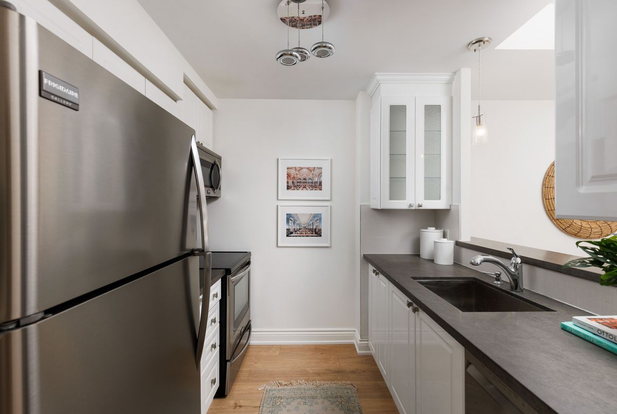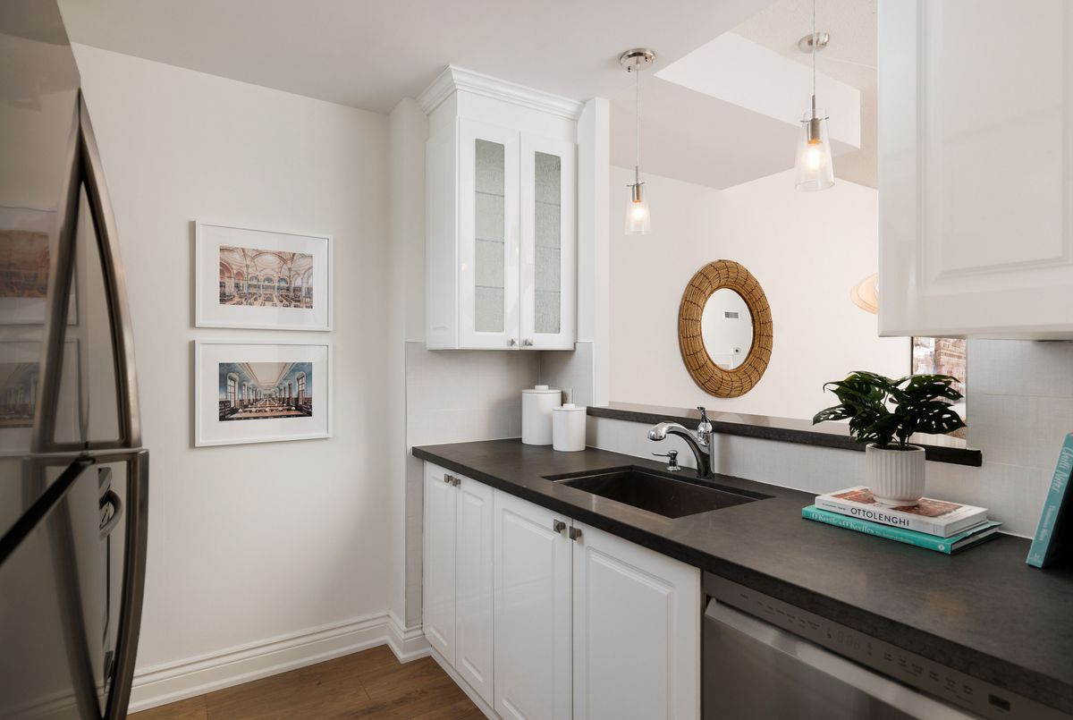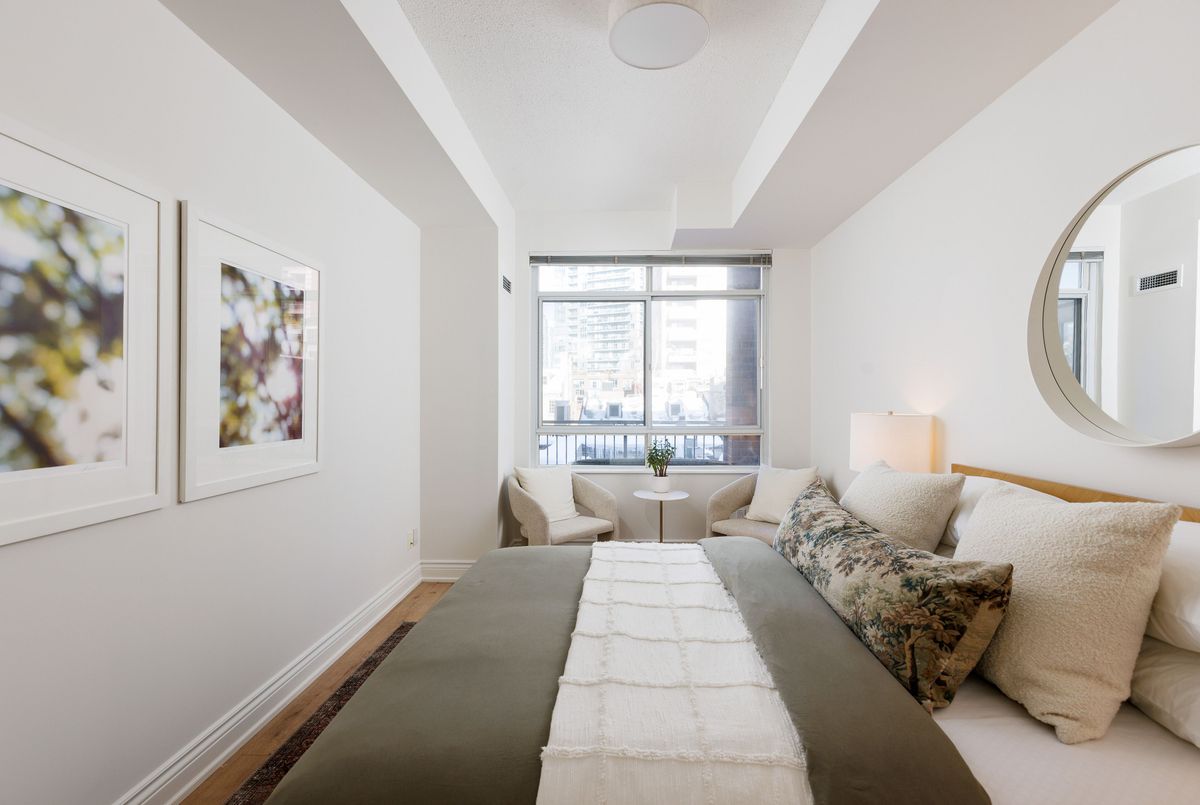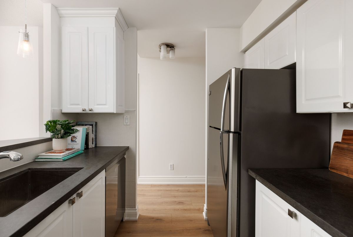 Welcome to this beautifully renovated 1 bedroom plus den suite at The Saint James, a low-rise, established, boutique building steps from the St Lawrence market and St James Park. Offering approximately 800 sq ft with 9' ceilings, this spacious home has been thoughtfully updated throughout. New laminate flooring, an updated kitchen, and renovated bathrooms create a fresh, move-in-ready living experience. Tucked away from the hustle and bustle of St. Lawrence Market, the suite enjoys a quiet exposure and opens onto a generous north-facing balcony, perfect for morning coffee or relaxing at the end of the day. The primary bedroom is exceptionally spacious, featuring a walk-in closet and private 4-piece ensuite. The den is a true separate room, generously sized and ideal as a guest bedroom, home office, or nursery. A convenient powder room off the entry adds everyday functionality and is perfect for guests. The open living and dining area flows seamlessly from the kitchen, creating a comfortable space for both entertaining and daily living. Complete with parking and locker, this well-appointed suite is steps to St. Lawrence Market, shops, restaurants, transit, and the Financial District-offering the perfect blend of space, style, and urban convenience without sacrificing peace and privacy. ...