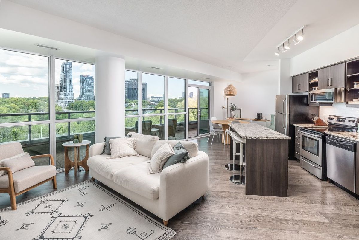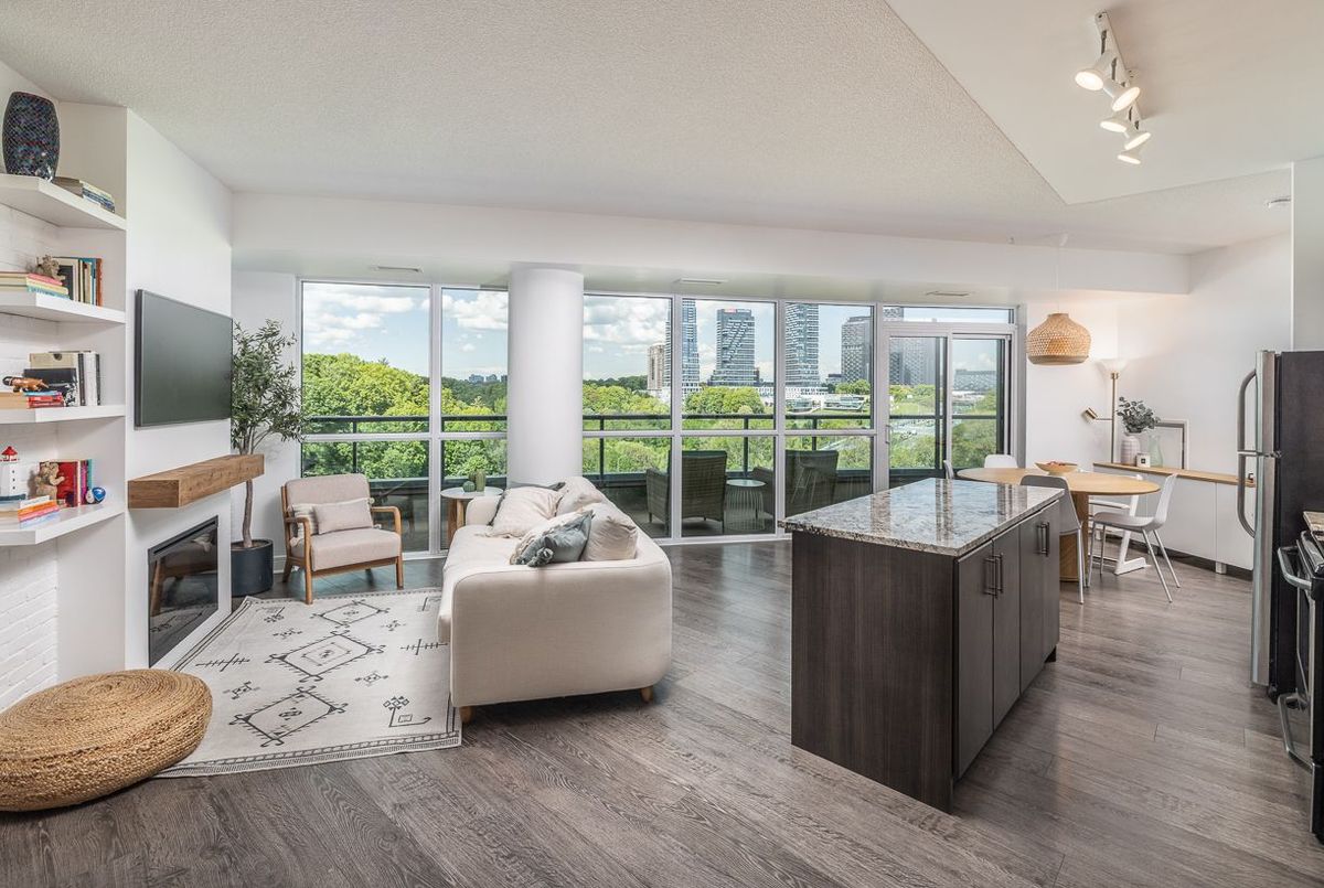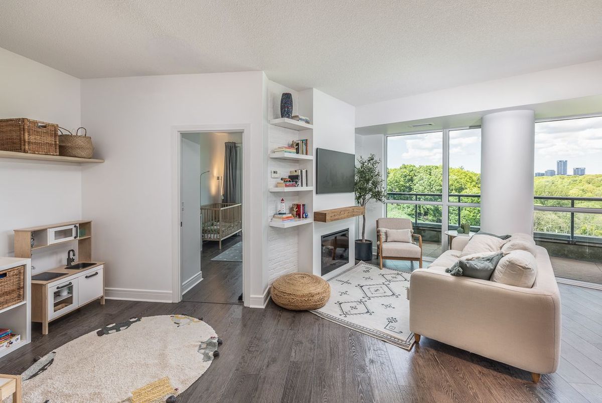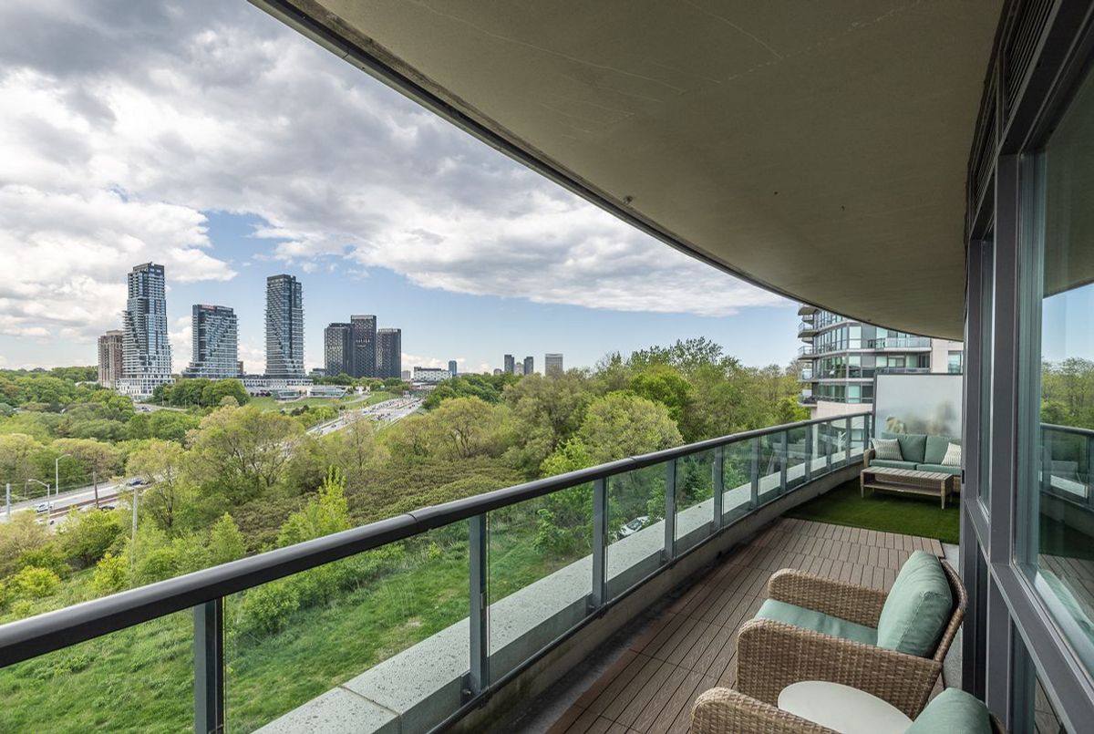Experience Elevated Living in the Heart of Midtown Toronto. Step into sophistication with this beautifully appointed 2 bedroom + den suite, complete with 2 full bathrooms, premium custom upgrades including electric fireplace, custom shelving, custom California Closets, custom kitchen backsplash and a sleek open-concept design that extends to a expansive wrap-around balcony with unobstructed views of Sunnybrook Park, perfect for entertaining or simplyunwinding as the sun goes down at the end of the day. This suite includes two parking spots and two storage lockers, perfect for those looking to upsize from a smaller condo or downsize from a larger home. Enjoy luxury amenities such as 24- hour concierge, first-class fitness centre, indoor pool, sauna, guest suites, community BBQ and visitor parking, all within a modern building. Perfectly situated just moments from Leaside's vibrant shops and dining, with seamless access to the Eglinton LRT and DVP, this is ultimate urban living.